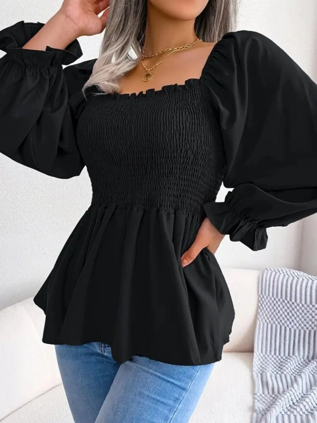 Kadın Uzun Kollu Geometrik Yakalı Gipe Detaylı Krep Bluz