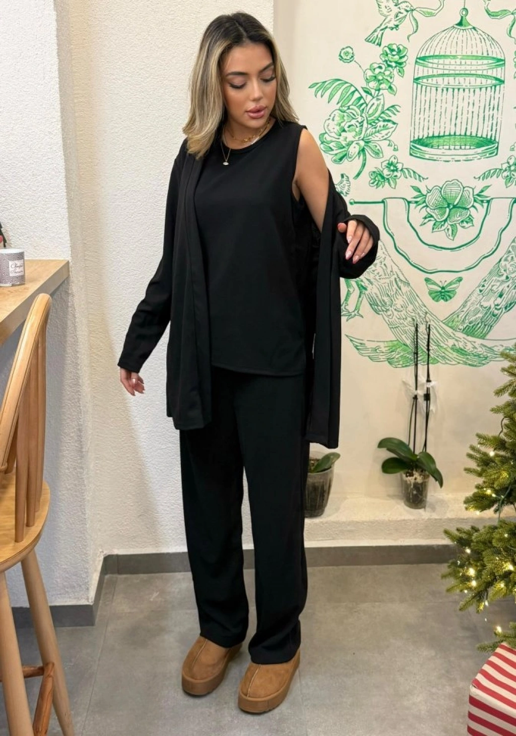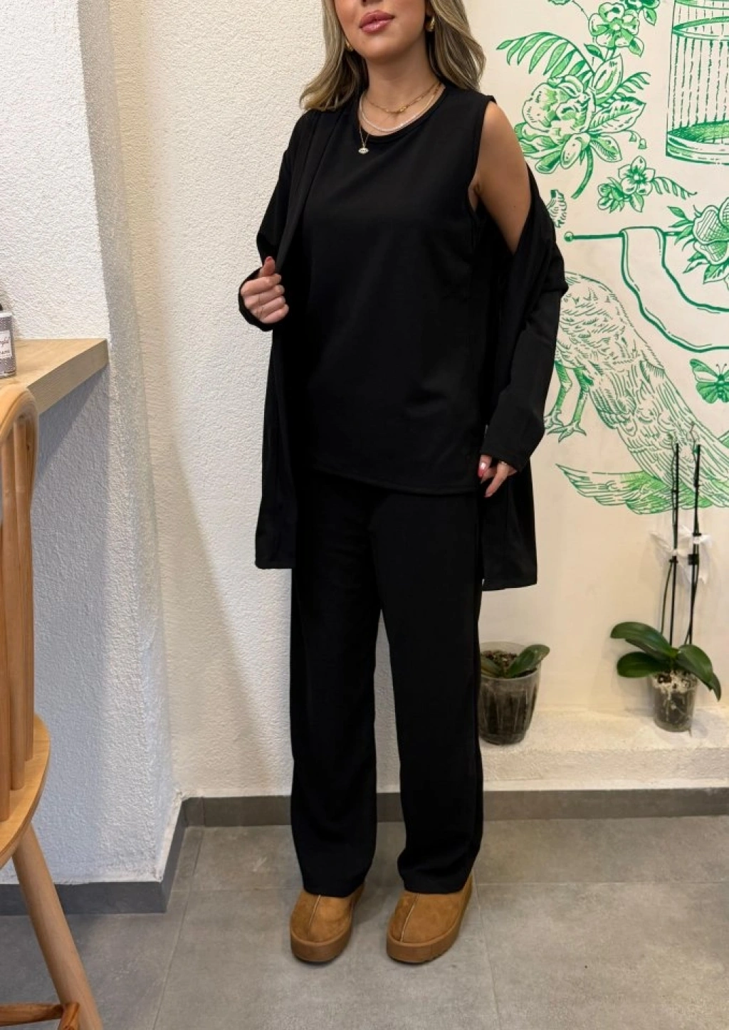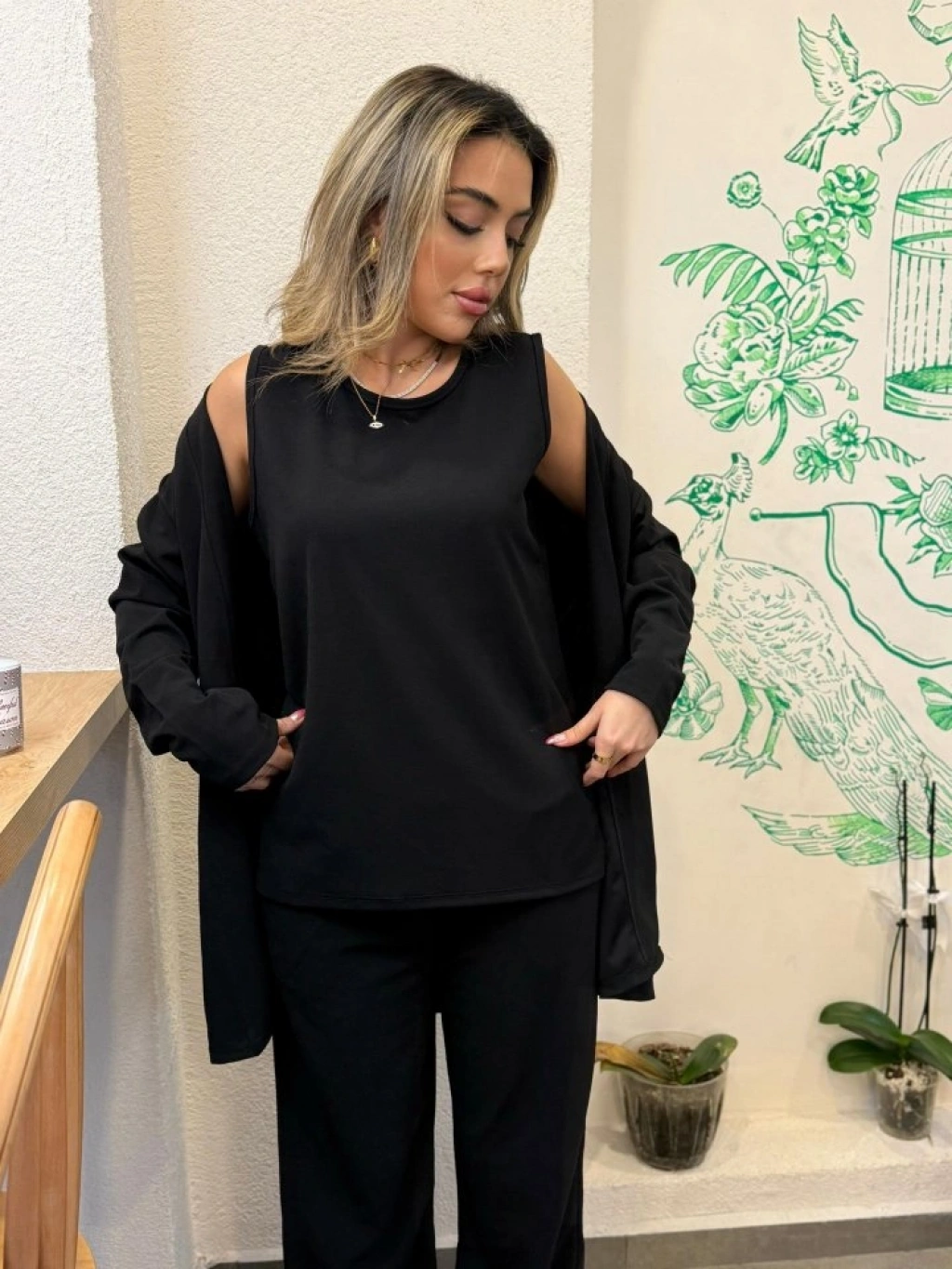 Kadın Uzun Kollu Ithal Krep Onu Açık Ceket Askılı Yuvarlak Yaka Bluz Ve Cepli Pantolon üçlü Takım