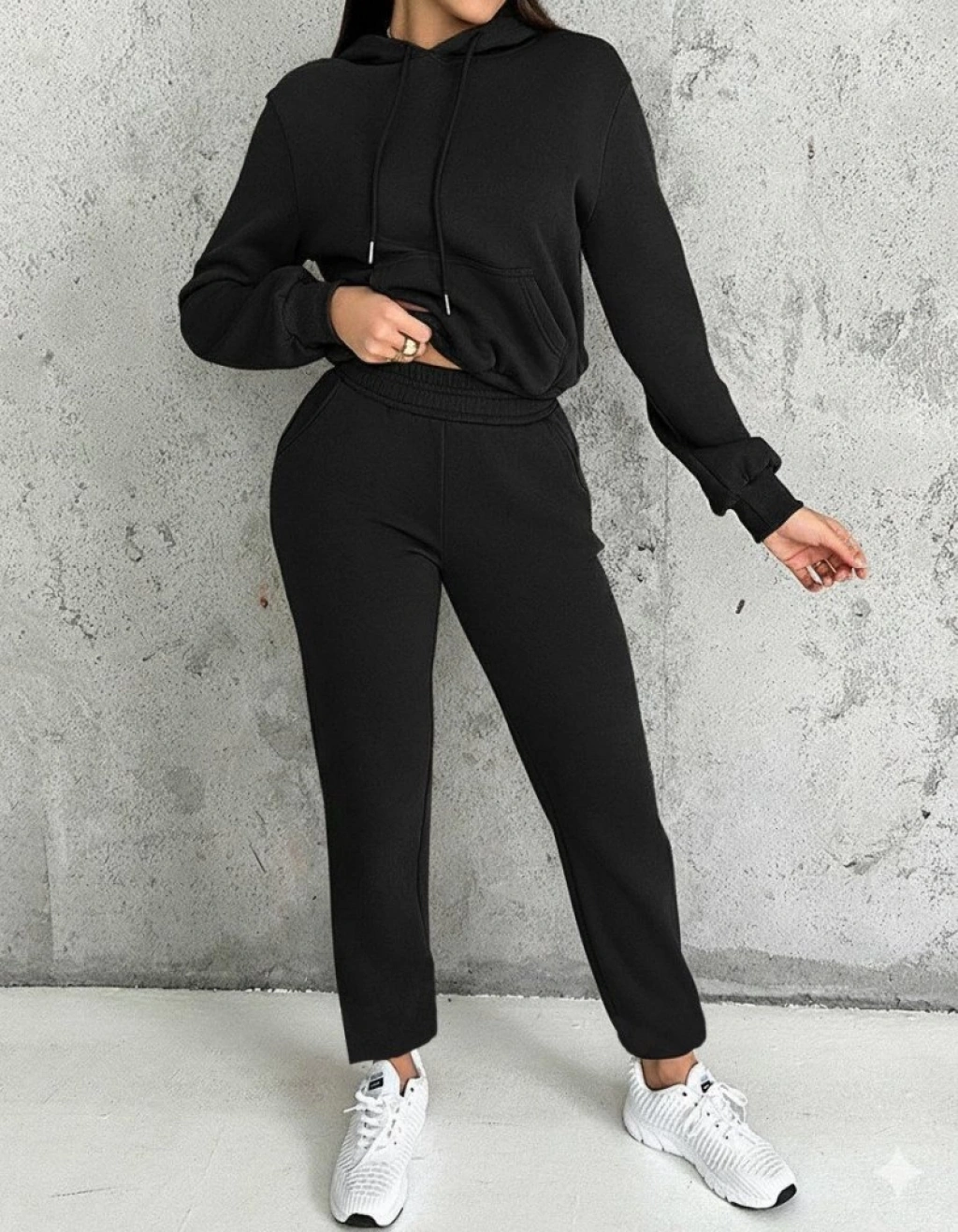 Kadın Uzun Kollu Kapşonlu Bağcıklı üç Iplik Bluz Ve Pantolon Ikili Takım