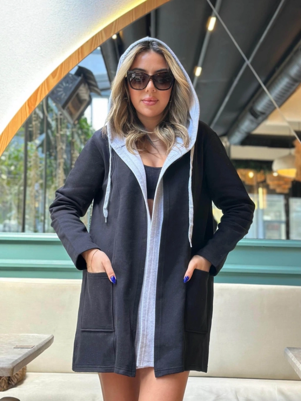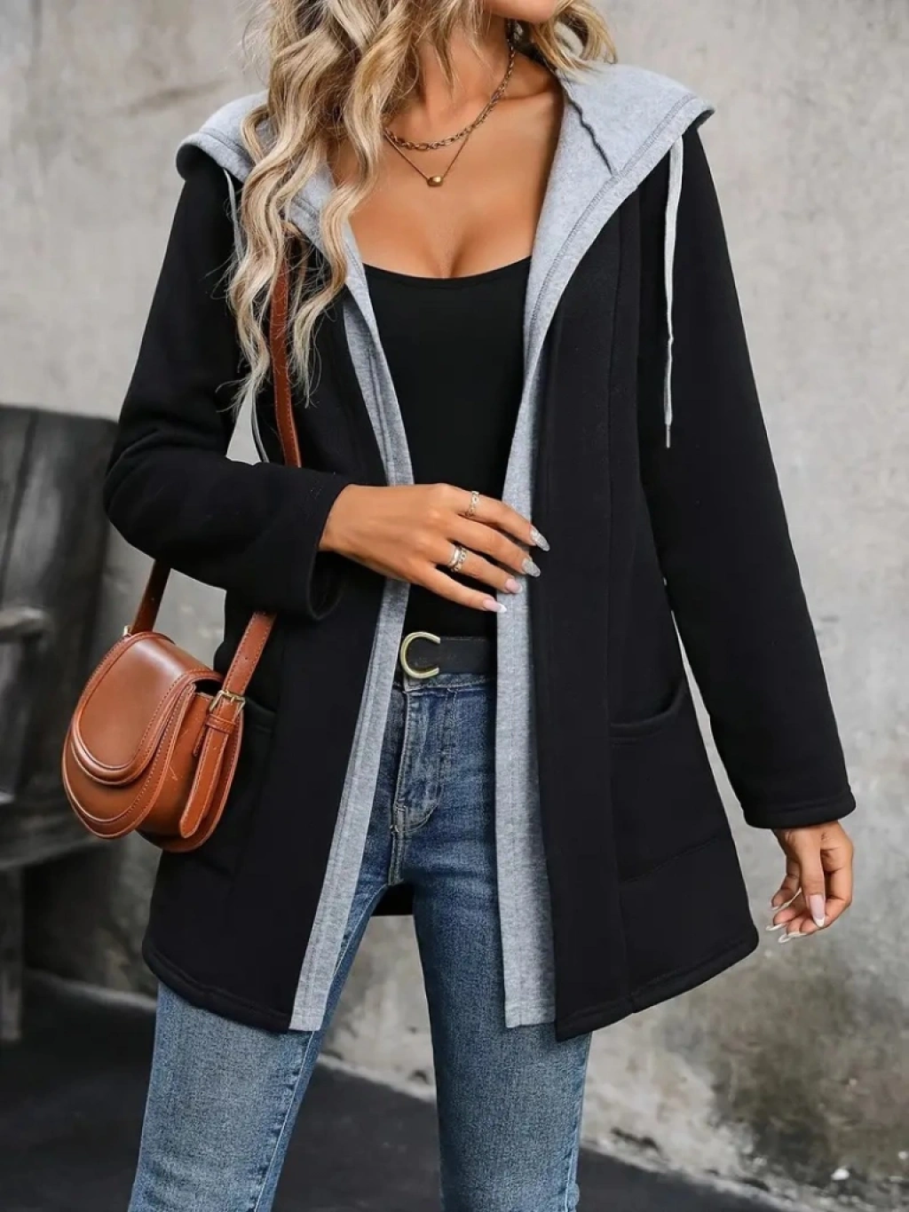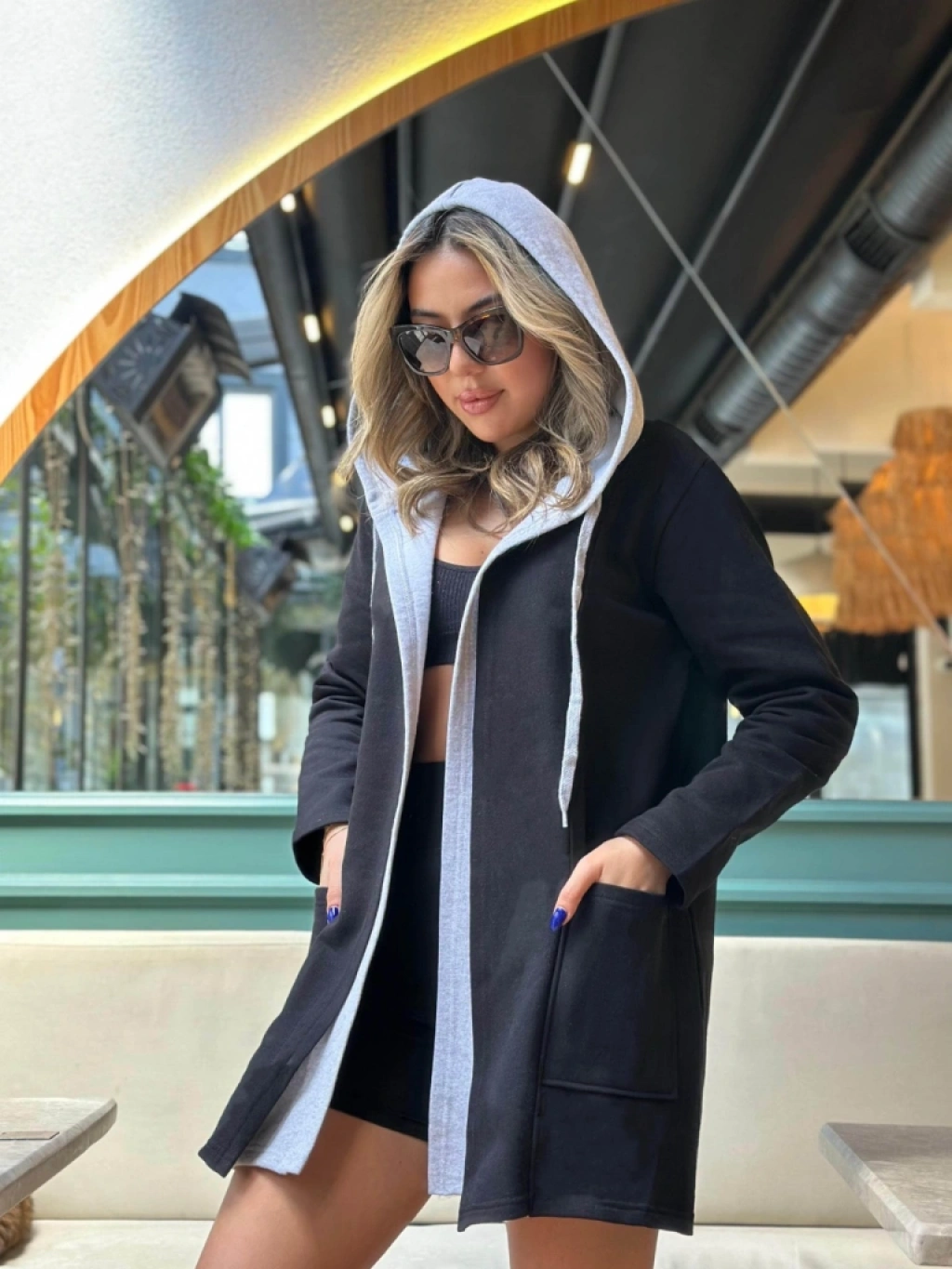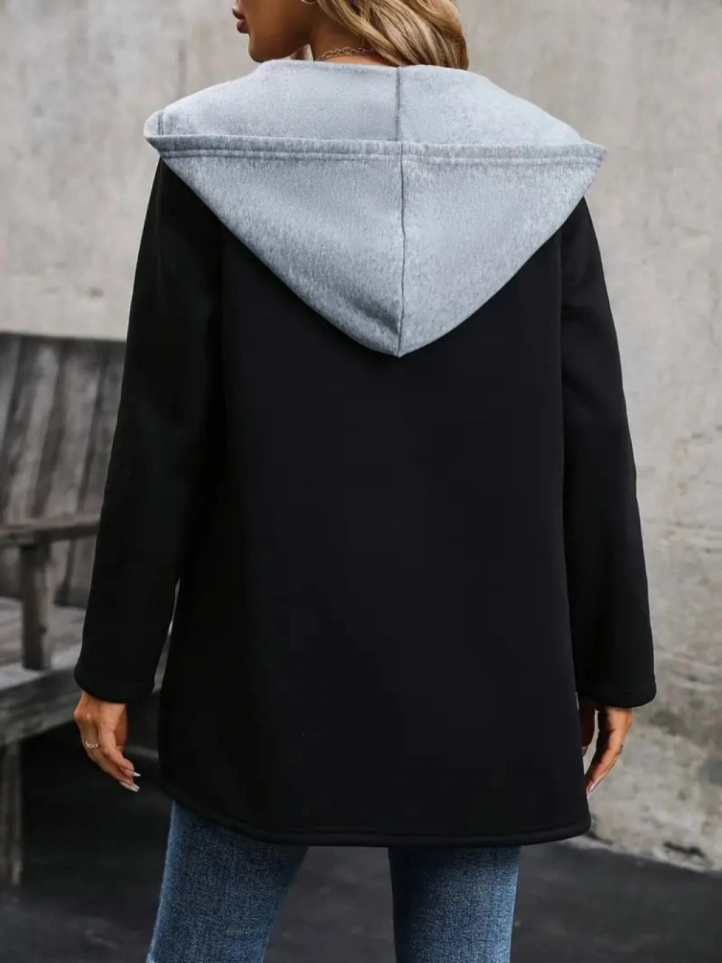 Kadın Uzun Kollu Kapşonlu çift Renkli şardonlu Iki Iplik Ceket