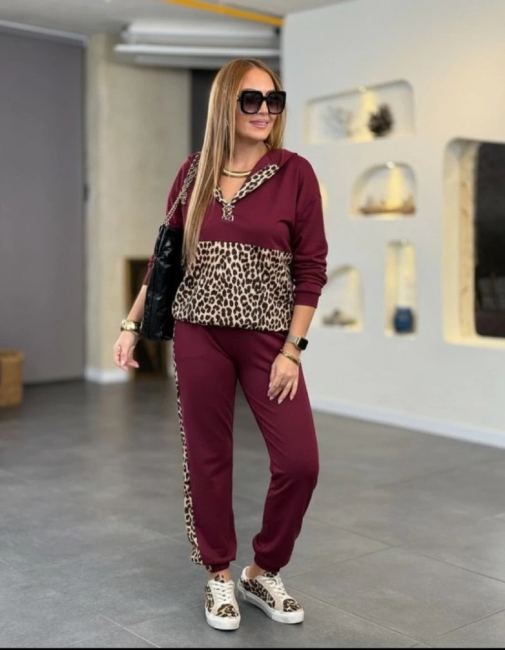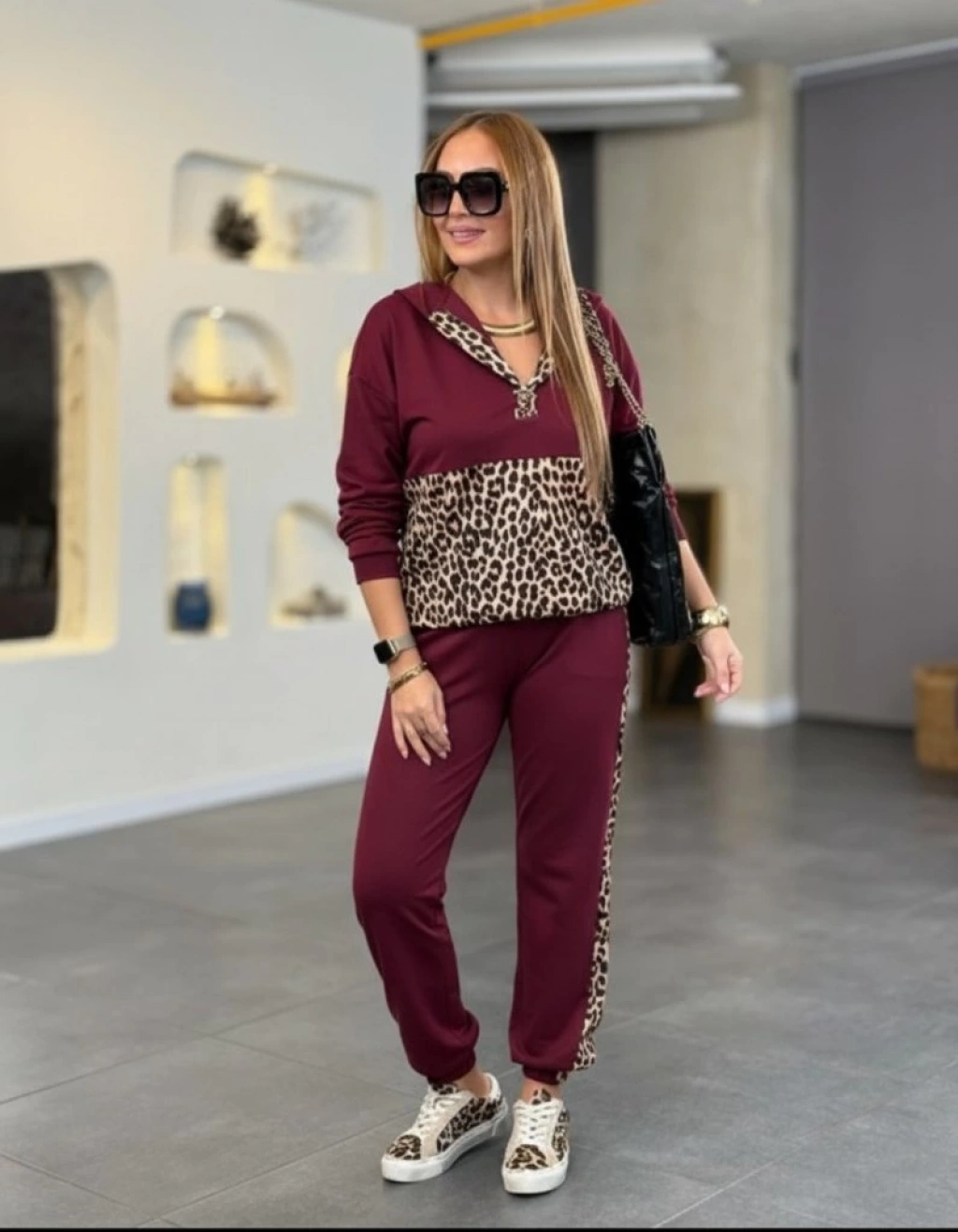 Kadın Uzun Kollu Kapşonlu Leopar Desen Detaylı Viskon Iki Iplik Bluz Ve Pantolon Ikili Takım