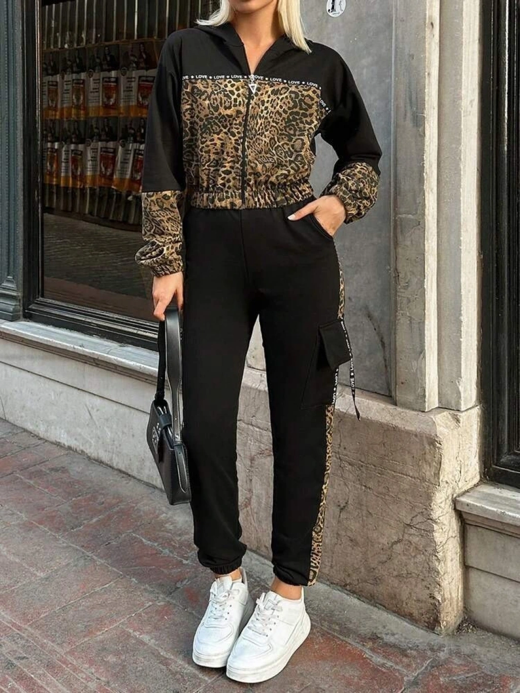 Kadın Uzun Kollu Kapşonlu Leopar Desenli Viskon Iki Iplik Bluz Ve Pantolon Ikili Takım