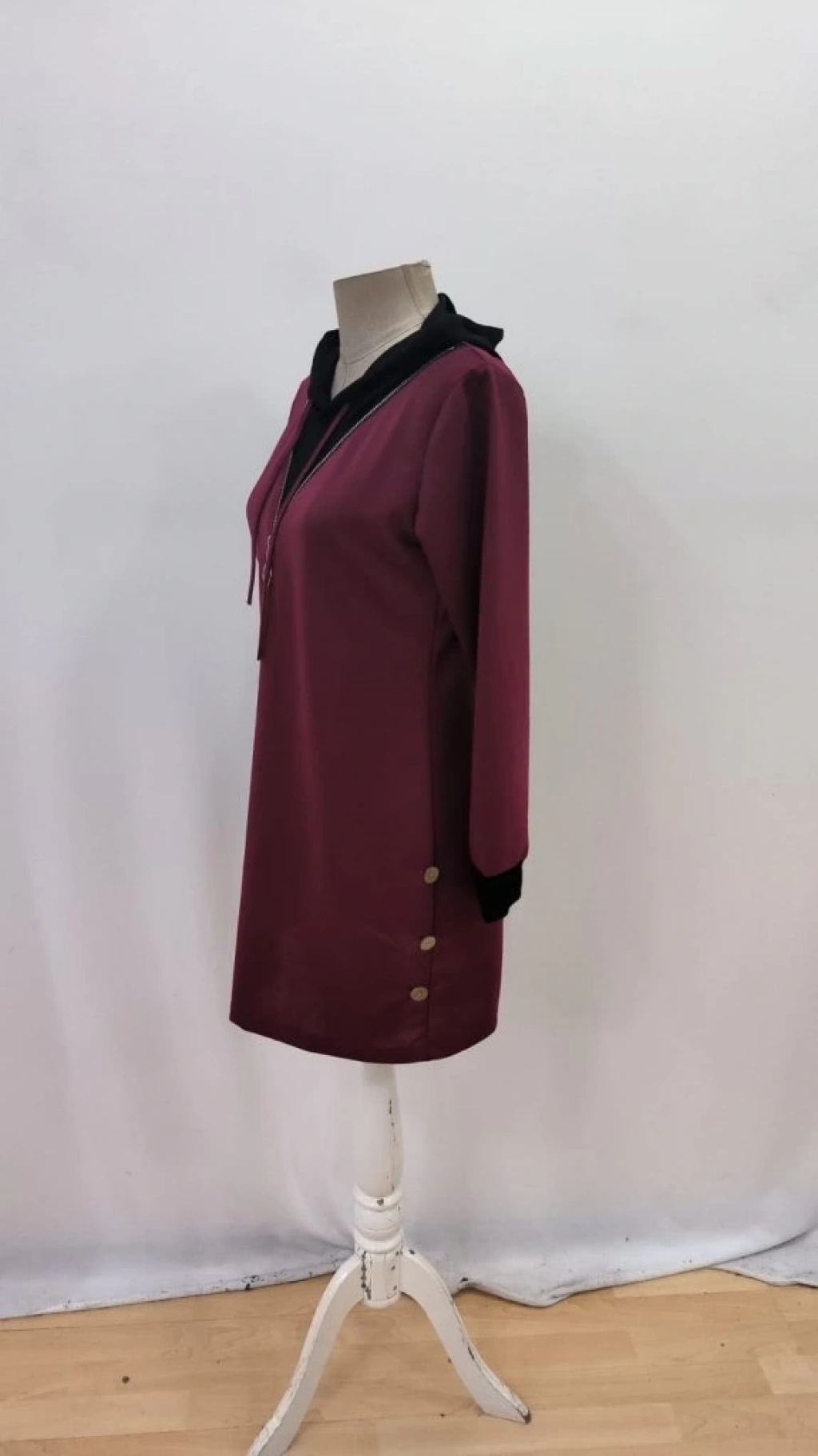 Kadın Uzun Kollu Kapşonlu önden Fermuarlı Düğmeli Mini Iki Iplik Elbise