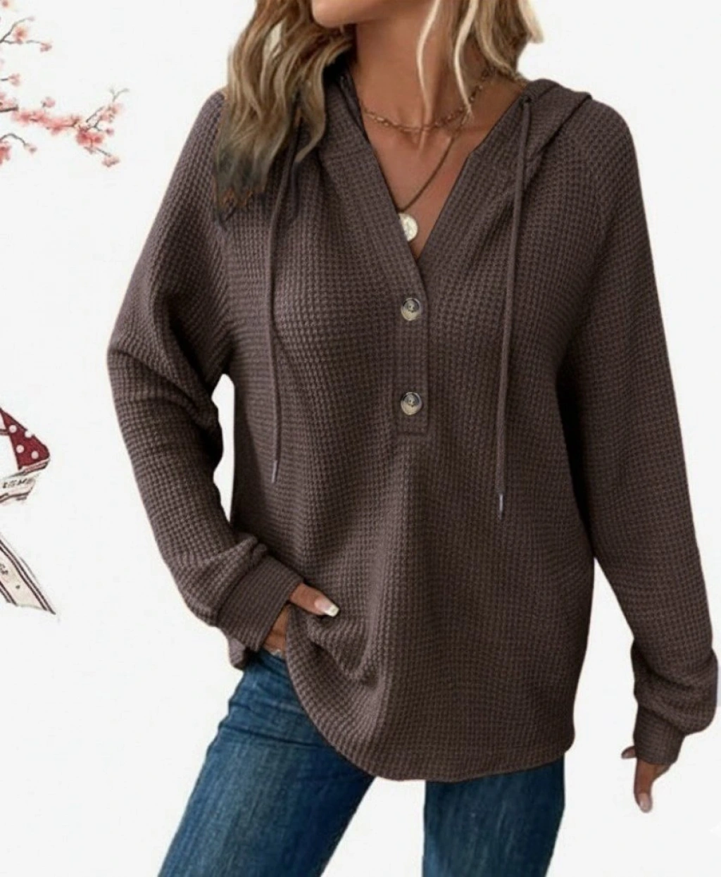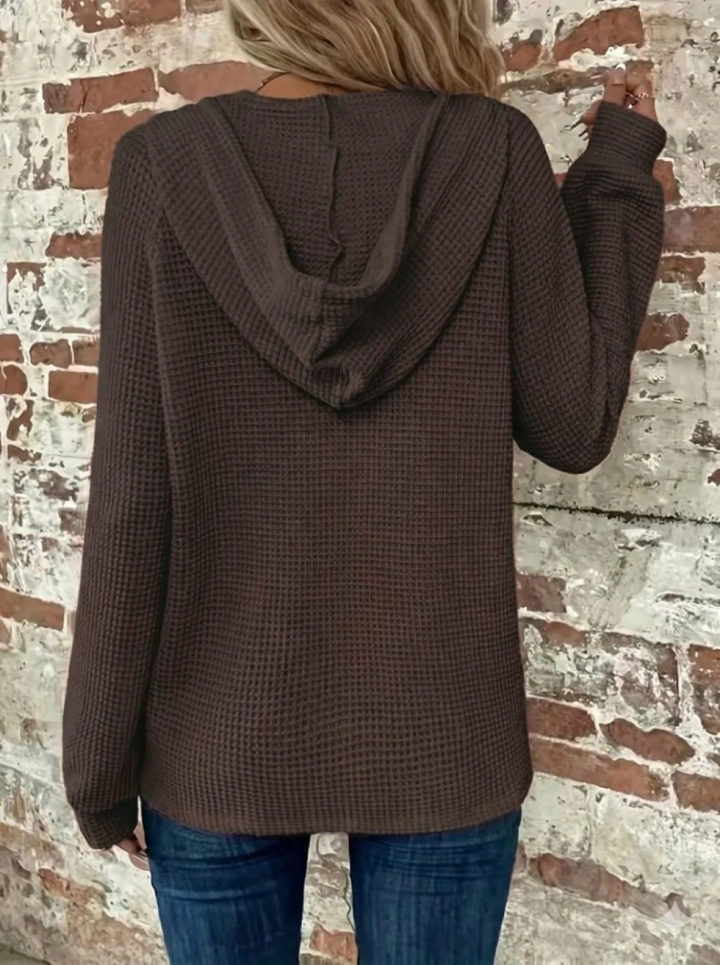 Kadın Uzun Kollu Kapşonlu önü Düğmeli Ve Bağcıklı Waffle Bluz