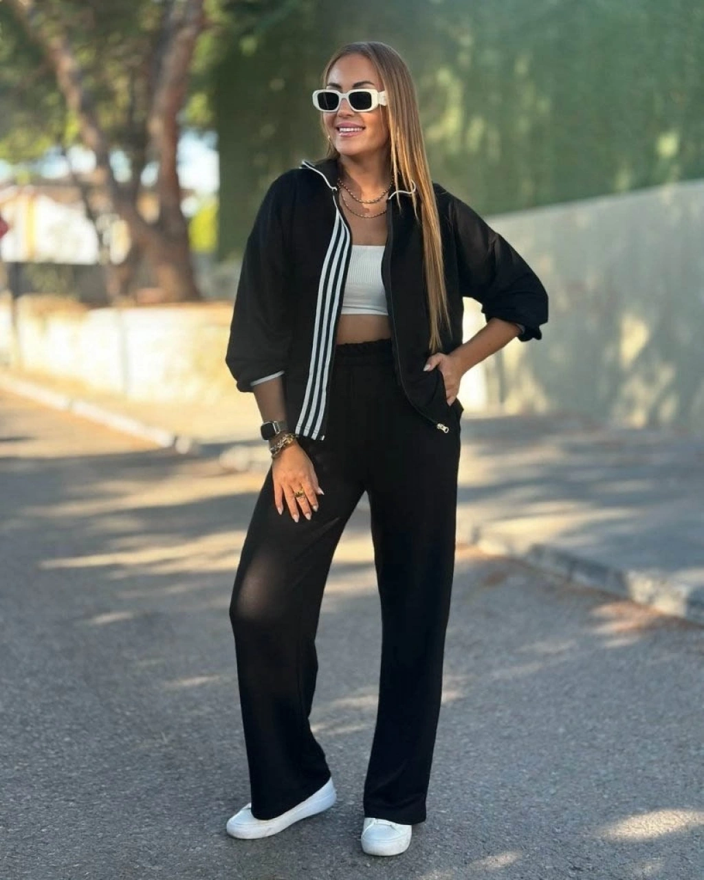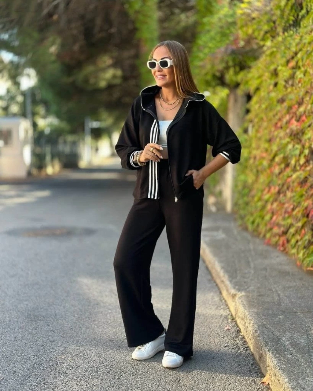 Kadın Uzun Kollu Kapşonlu Onu şerit Detaylı Fermuarlı Viskon Iki Iplik Bluz Ve Pantolon Ikili Takım
