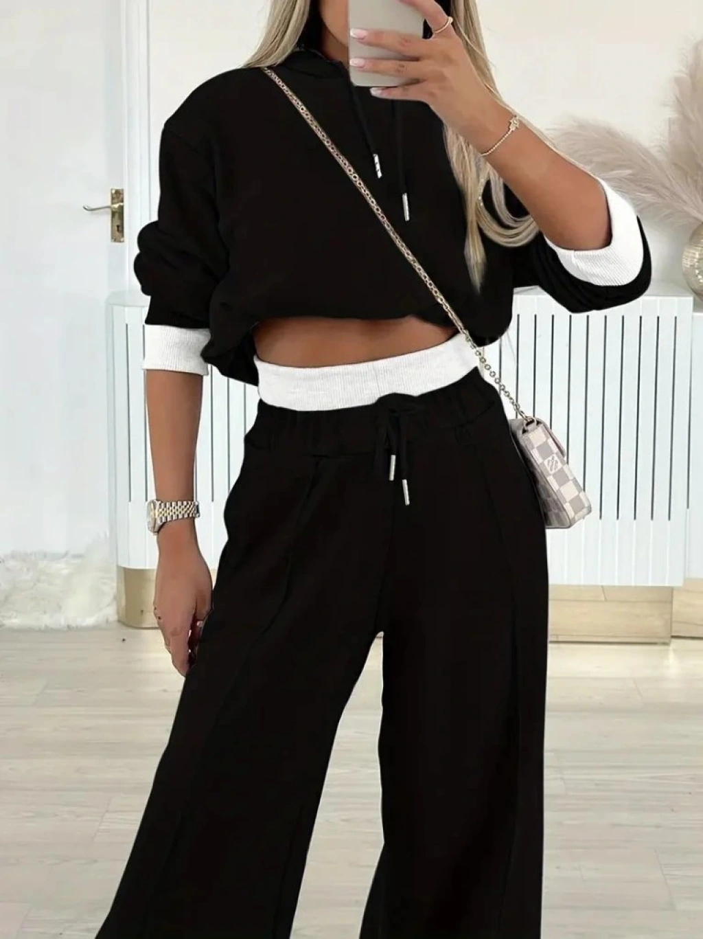 Kadın Uzun Kollu Kapşonlu Viskon Iki Iplik Bluz Ve Pantolon Ikili Takım