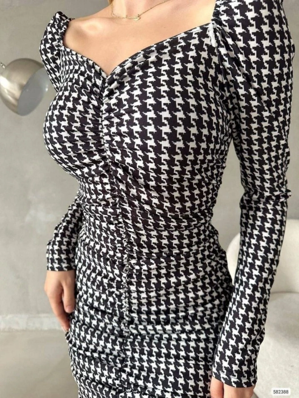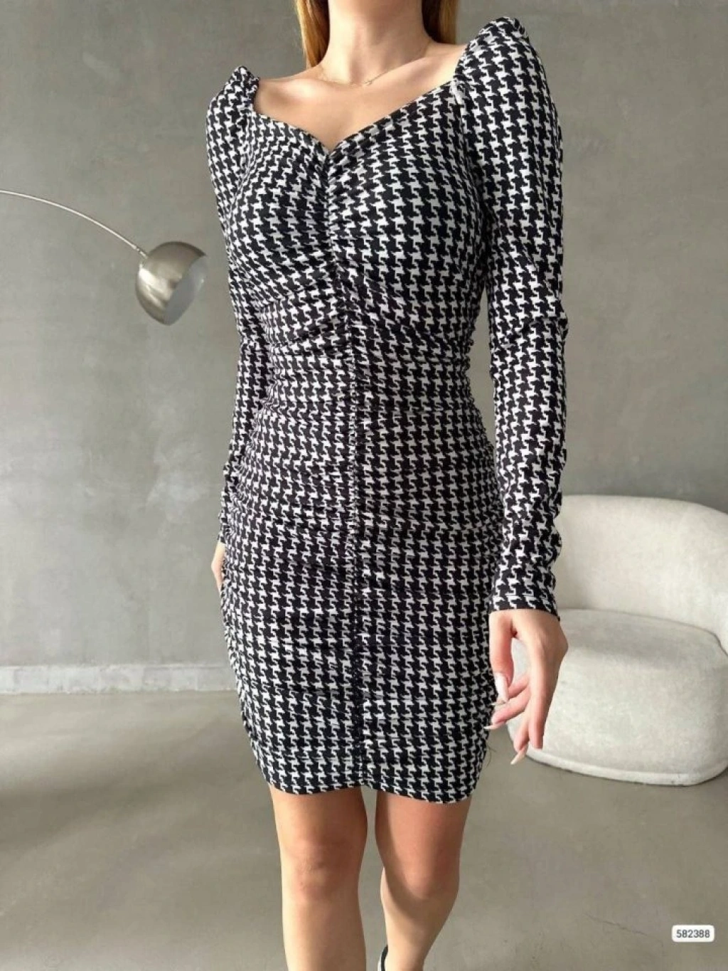 Kadın Uzun Kollu Kare Yaka Kazayağı Desen önü Büzgülü Mini Elbise