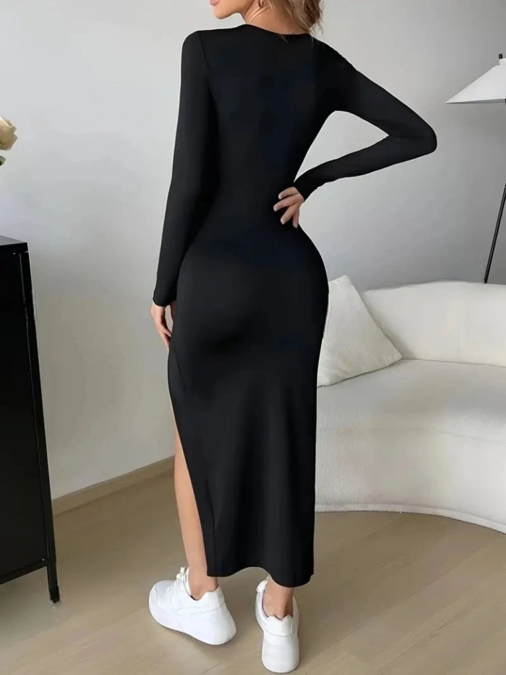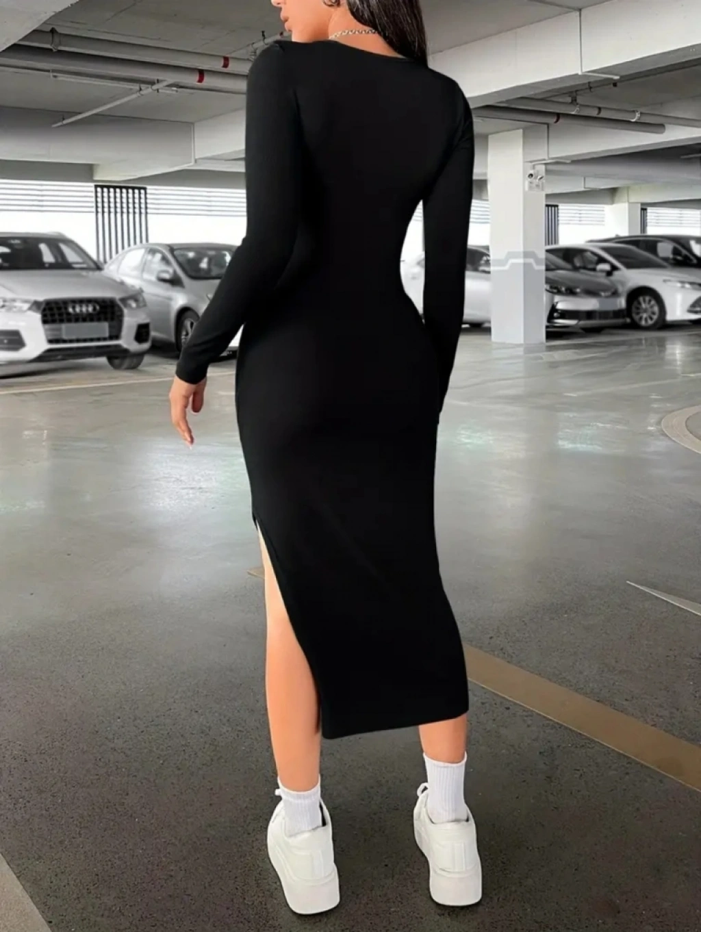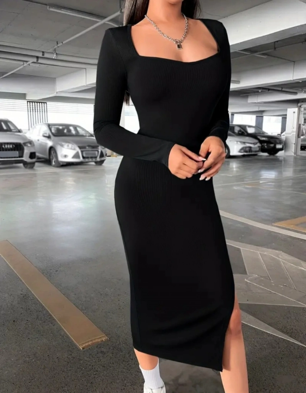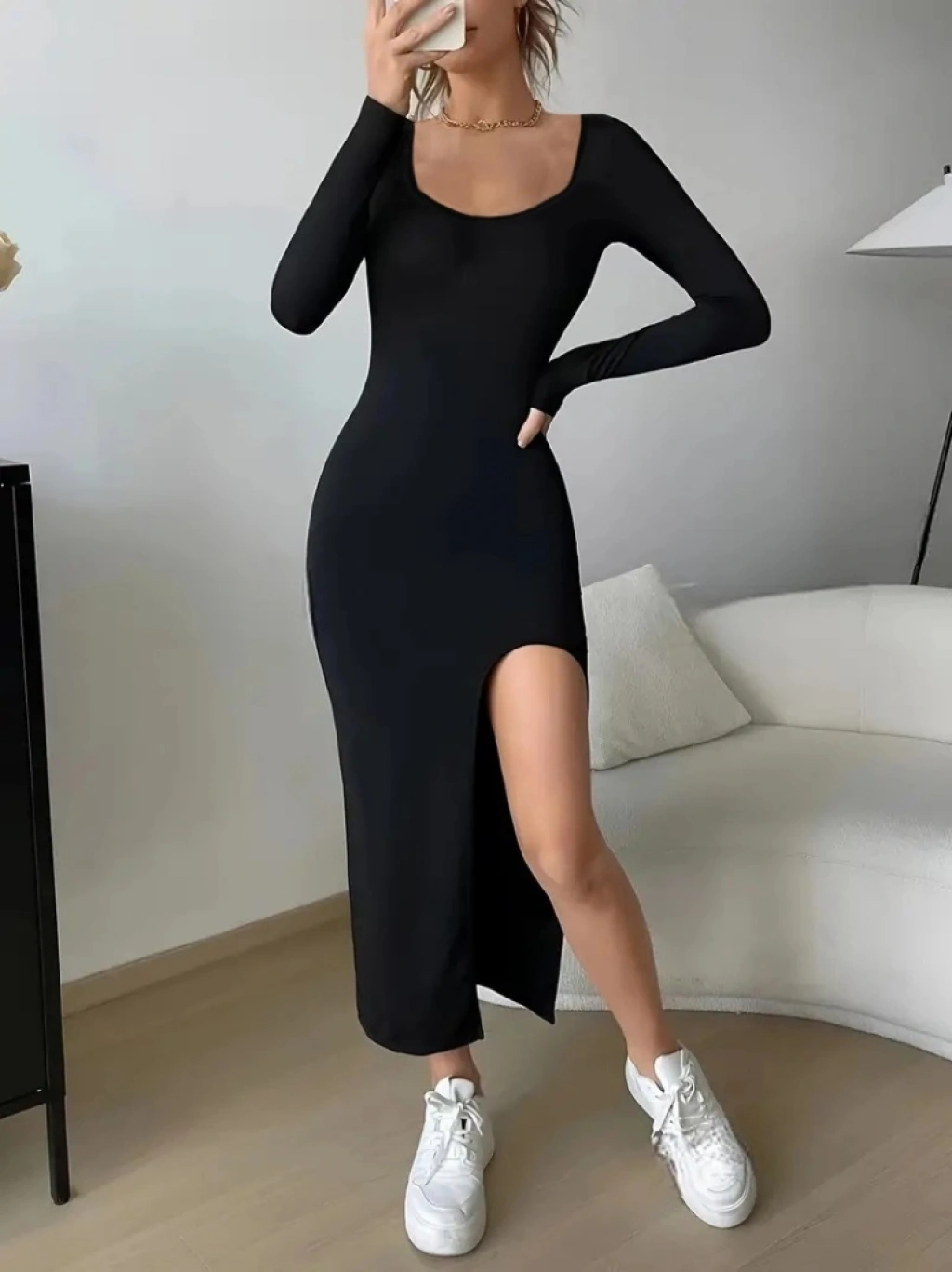 Kadın Uzun Kollu Kare Yaka Yırtmaçlı Uzun Sandy Elbise