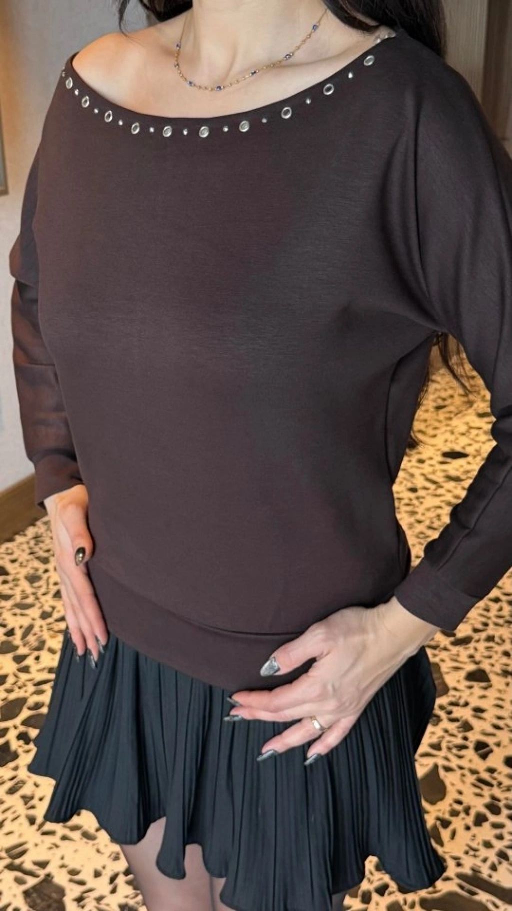 Kadın Uzun Kollu Kayık Yaka Kuş Gözü Detay Bluz