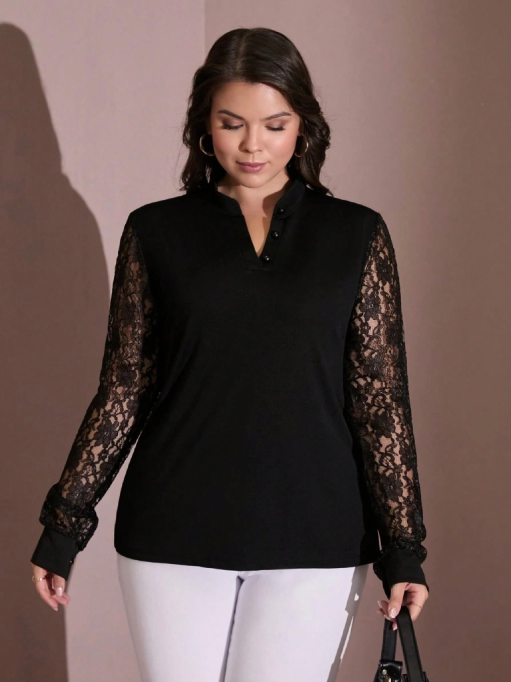 Kadın Uzun Kollu Kolları Dantelli Hakim Yaka Büyük Beden Krep Bluz
