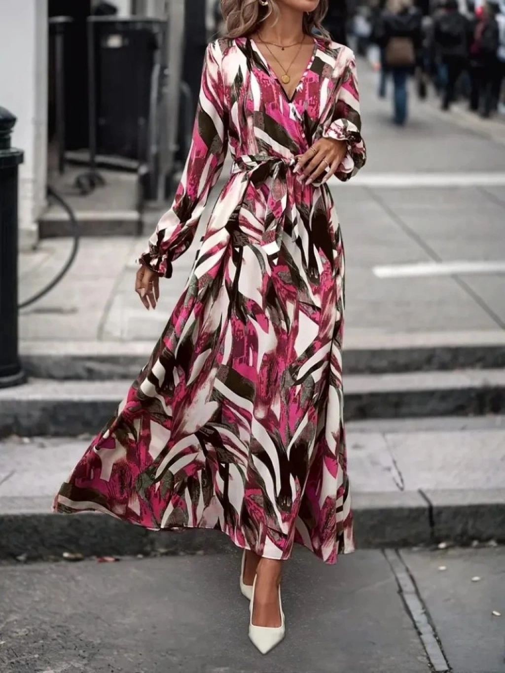 Kadın Uzun Kollu Kruvaze Yaka Belden Kuşaklı Desenli Süprem Elbise