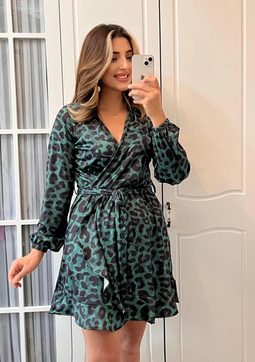 Kadın Uzun Kollu Kruvaze Yaka Belden Kuşaklı Leopar Desenli Dalgıç Elbise