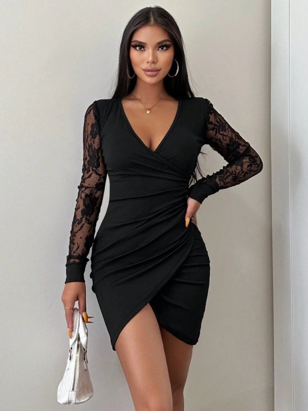Kadın Uzun Kollu Kruvaze Yaka Beli Düğme Detay Krep Elbise