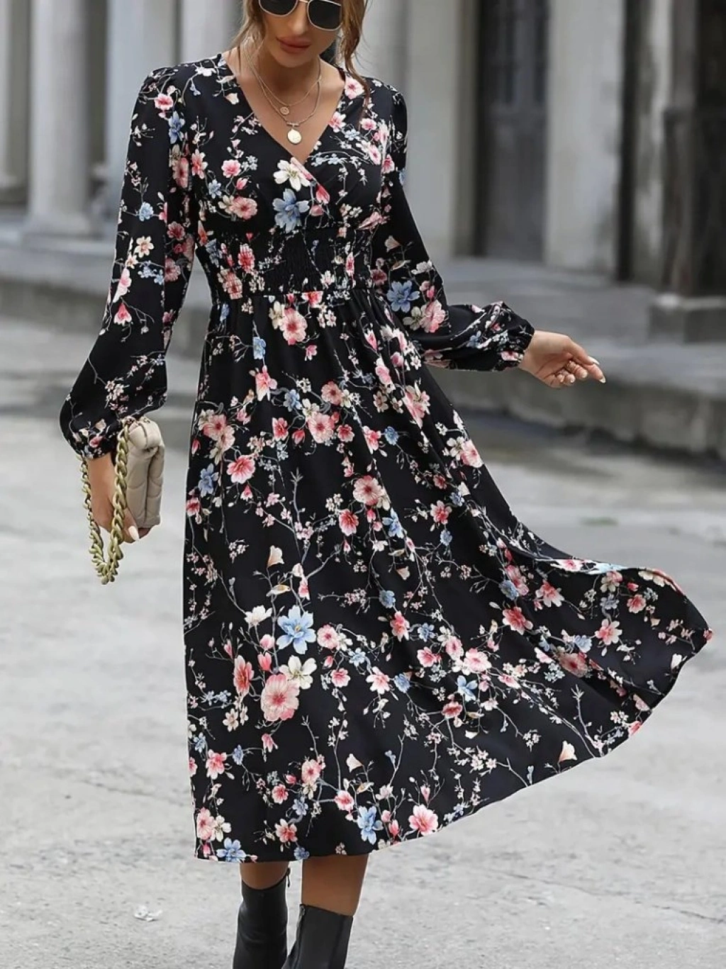 Kadın Uzun Kollu Kruvaze Yaka Beli Lastikli Yandan Yırtmaçlı Desenli Dalgıç Elbise