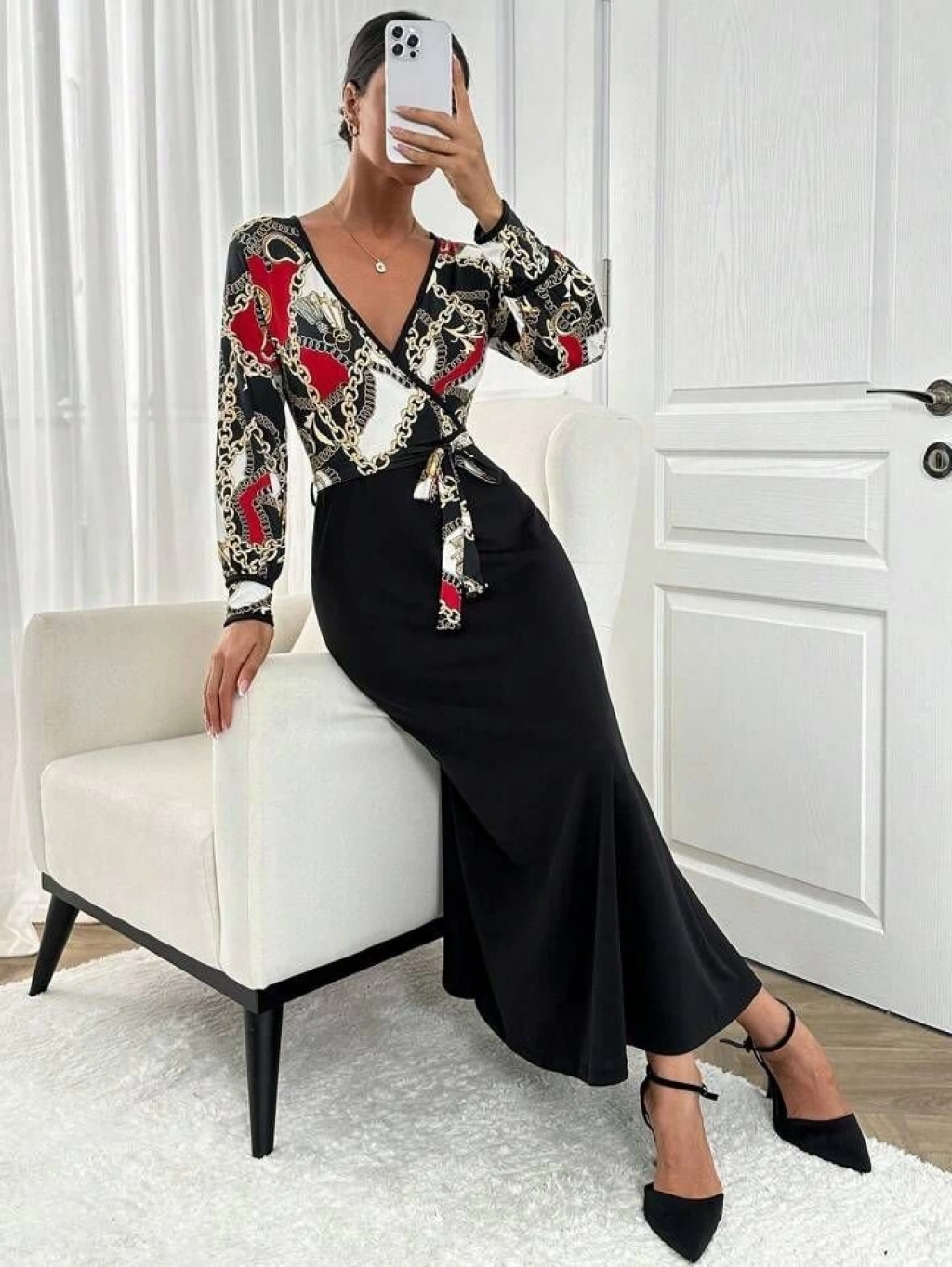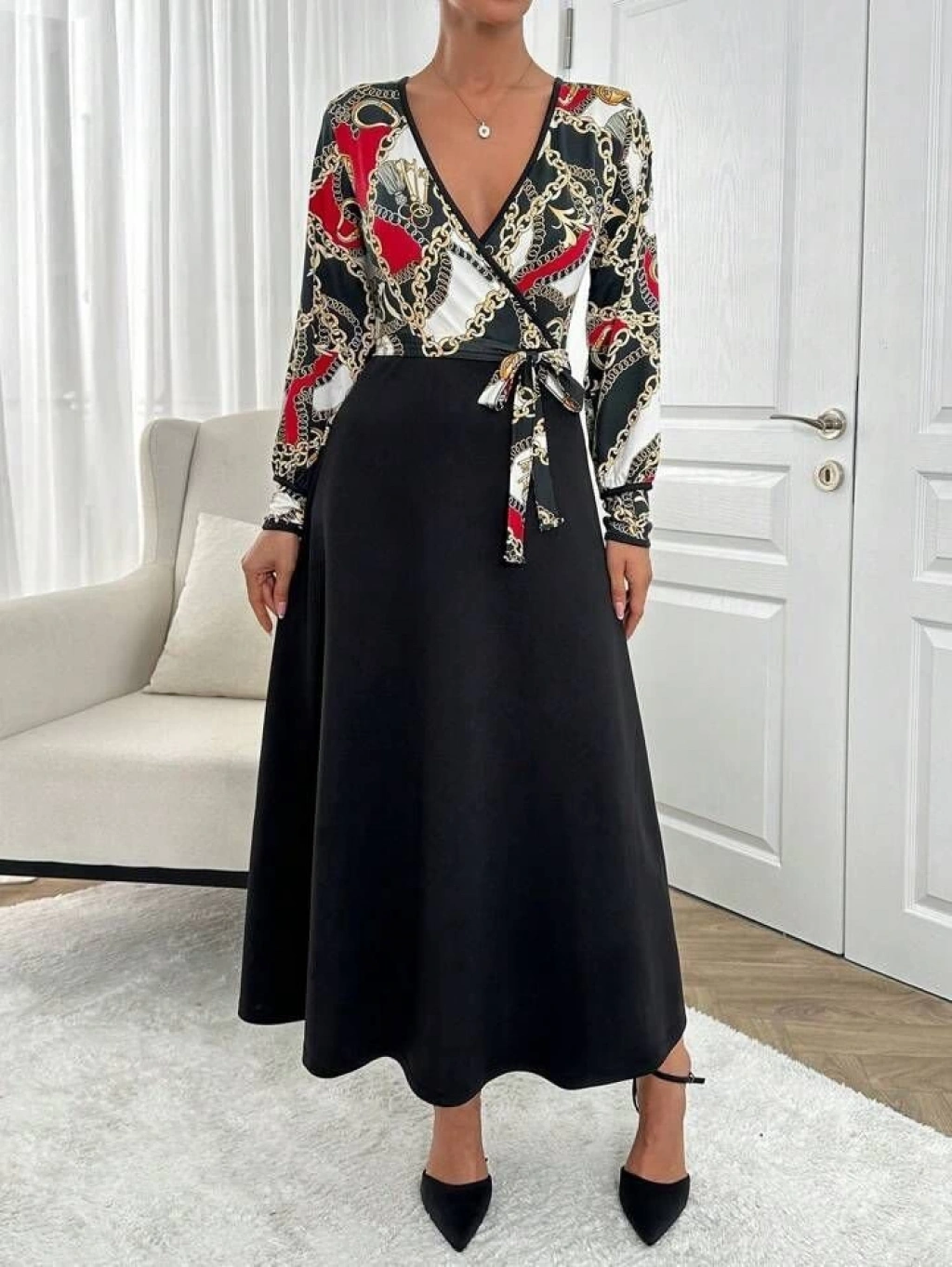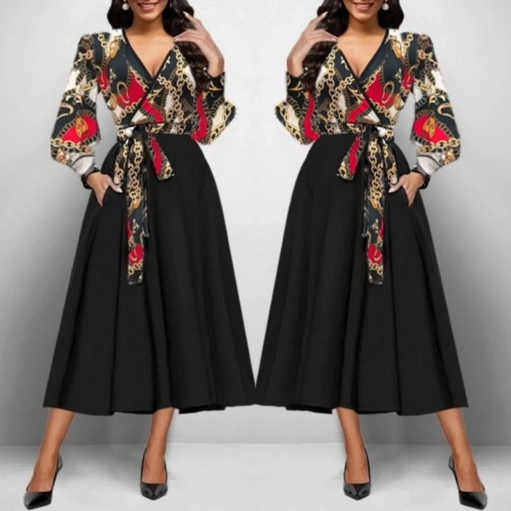 Kadın Uzun Kollu Kruvaze Yaka Dalgıç Krep Midi Boy Elbise