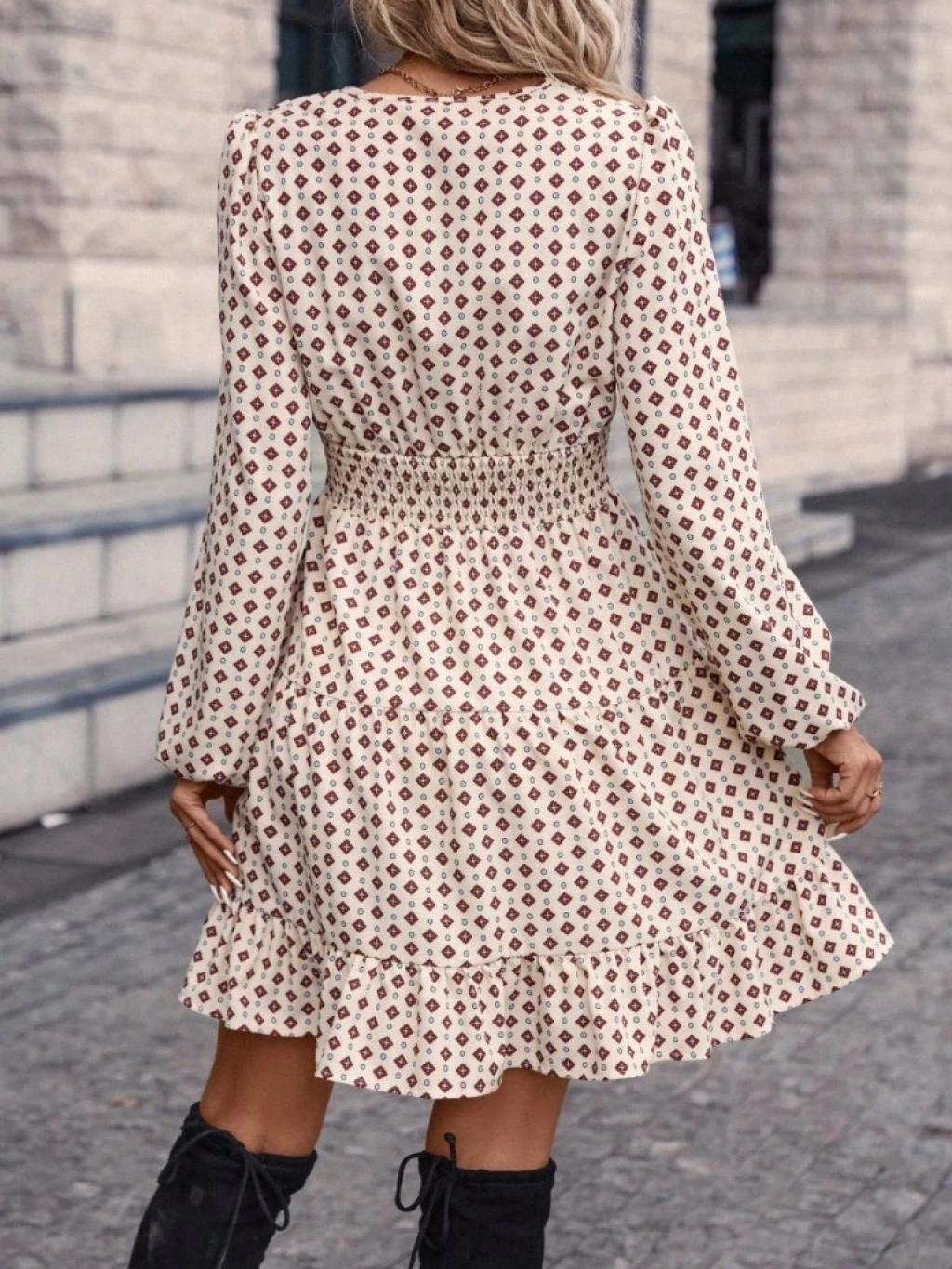 Kadın Uzun Kollu Kruvaze Yaka Desenli Mini Modal Elbise