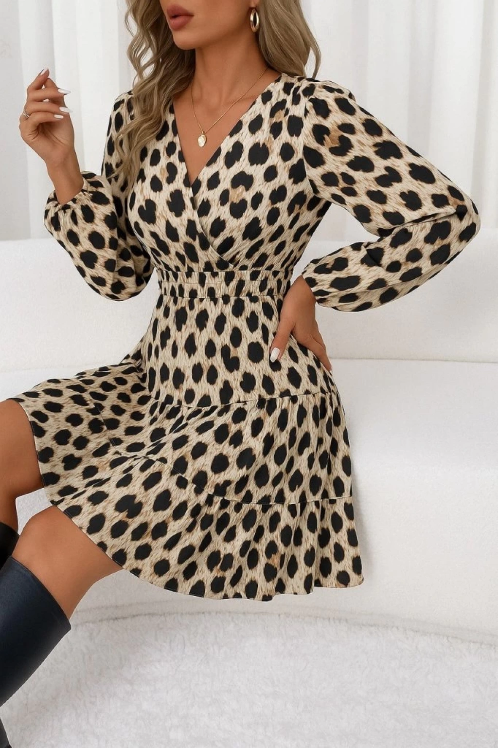 Kadın Uzun Kollu Kruvaze Yaka Desenli Mini Modal Elbise