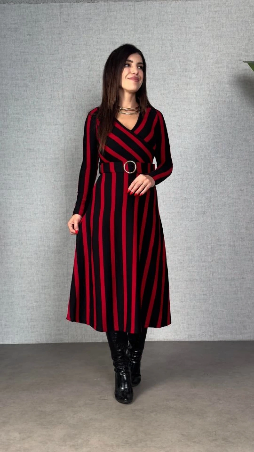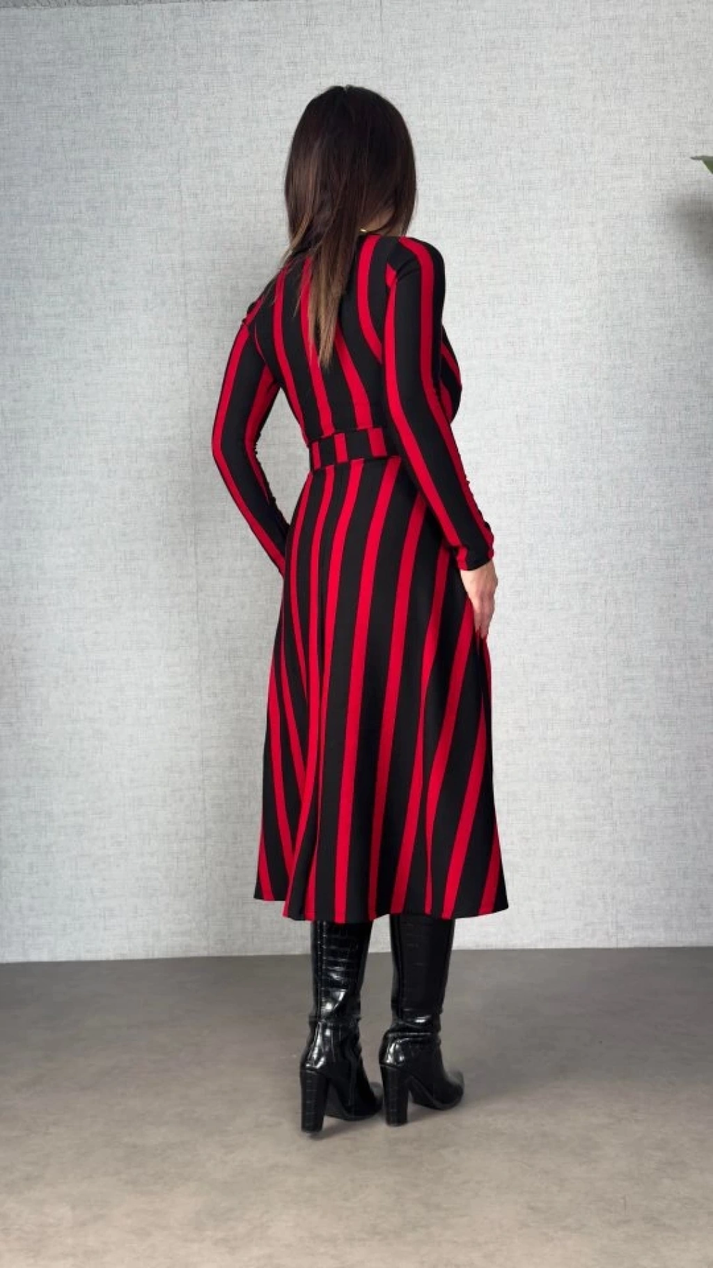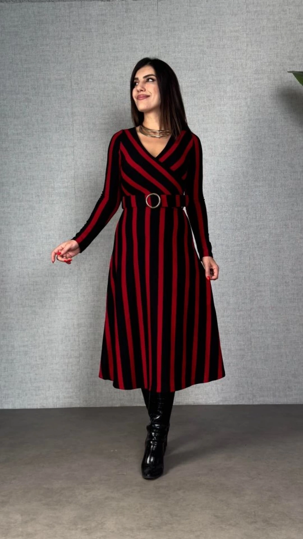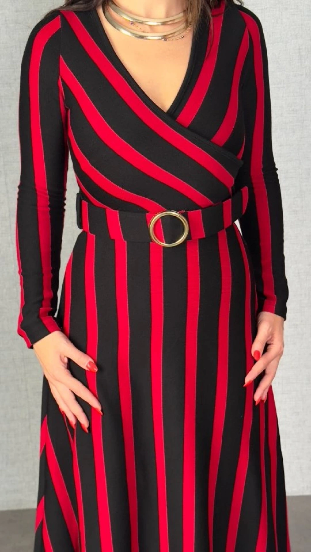 Kadın Uzun Kollu Kruvaze Yaka Kemer Dahil çizgili Triko Elbise