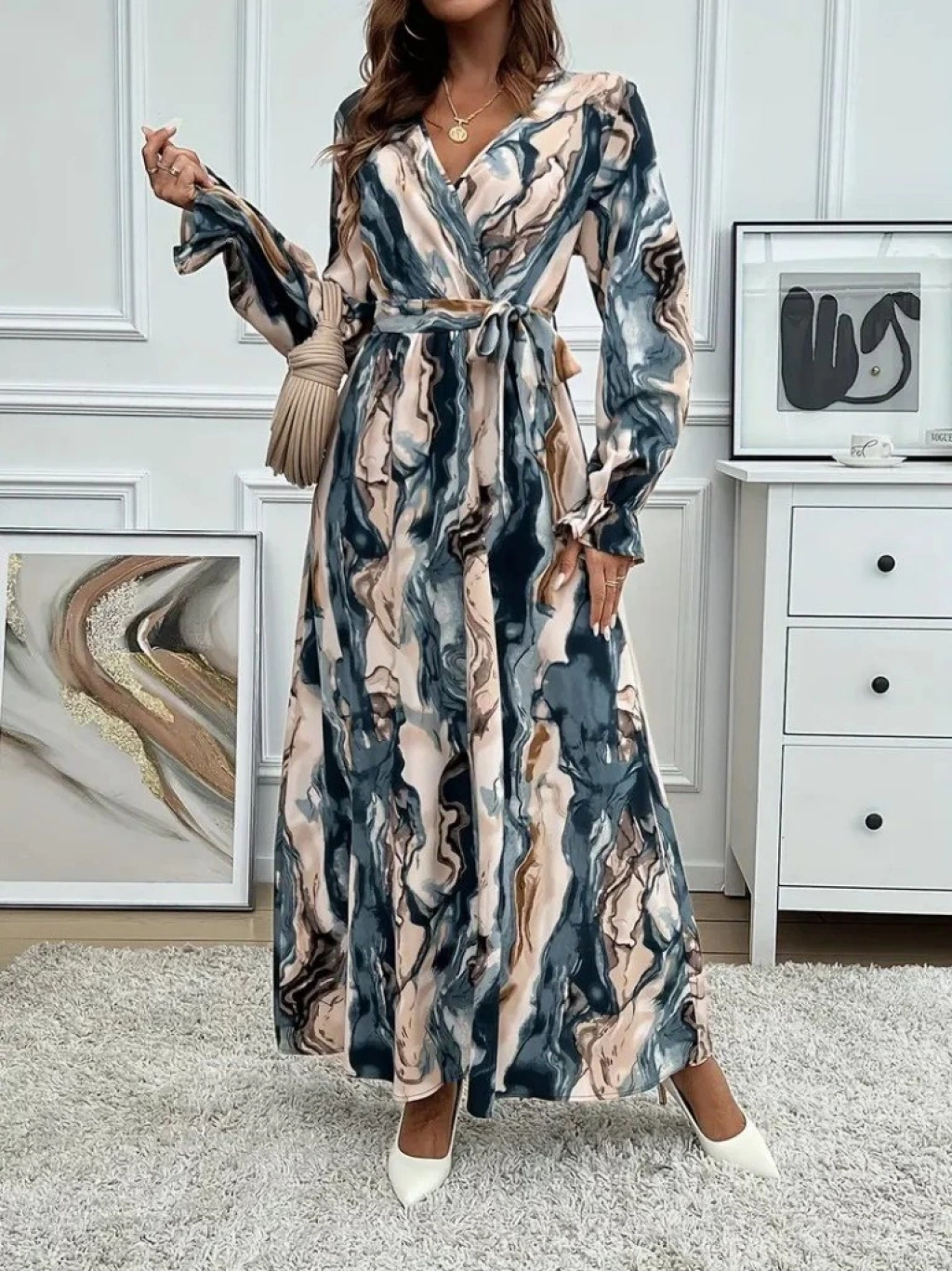 Kadın Uzun Kollu Kruvaze Yakalı Beli Kuşaklı Desenli Süprem Maxi Elbise