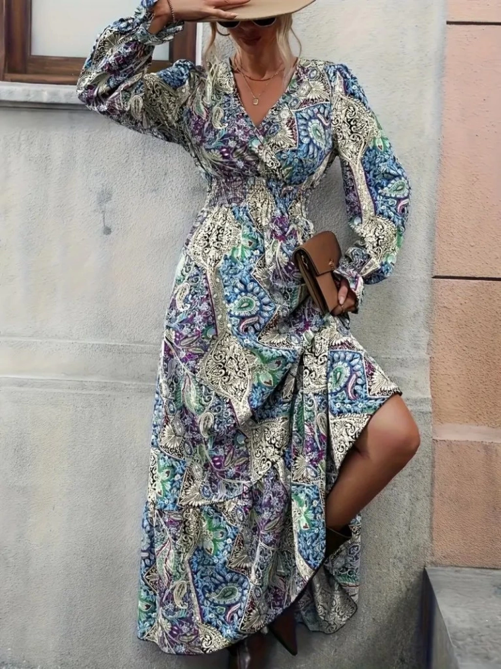Kadın Uzun Kollu Kruvaze Yakalı Desenli Süprem Maxi Elbise