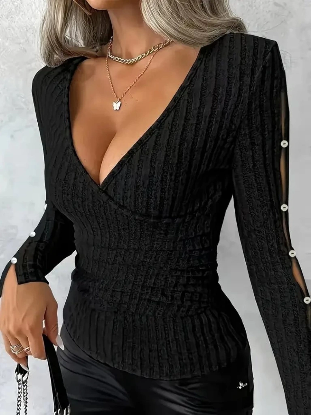 Kadın Uzun Kollu Kruvaze Yakalı Incili şardonlu Kaşkorse Bluz