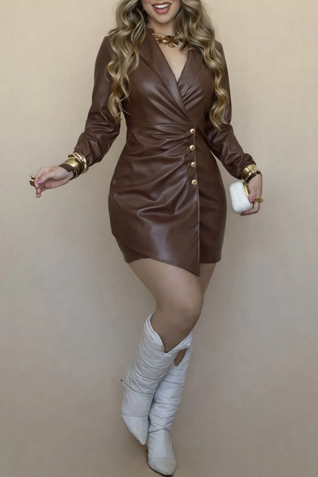 Kadın Uzun Kollu Kruvaze Yakalı önden Büzgü Ve Düğmeli Asimetrik Kesim Detaylı Mini Deri Elbise