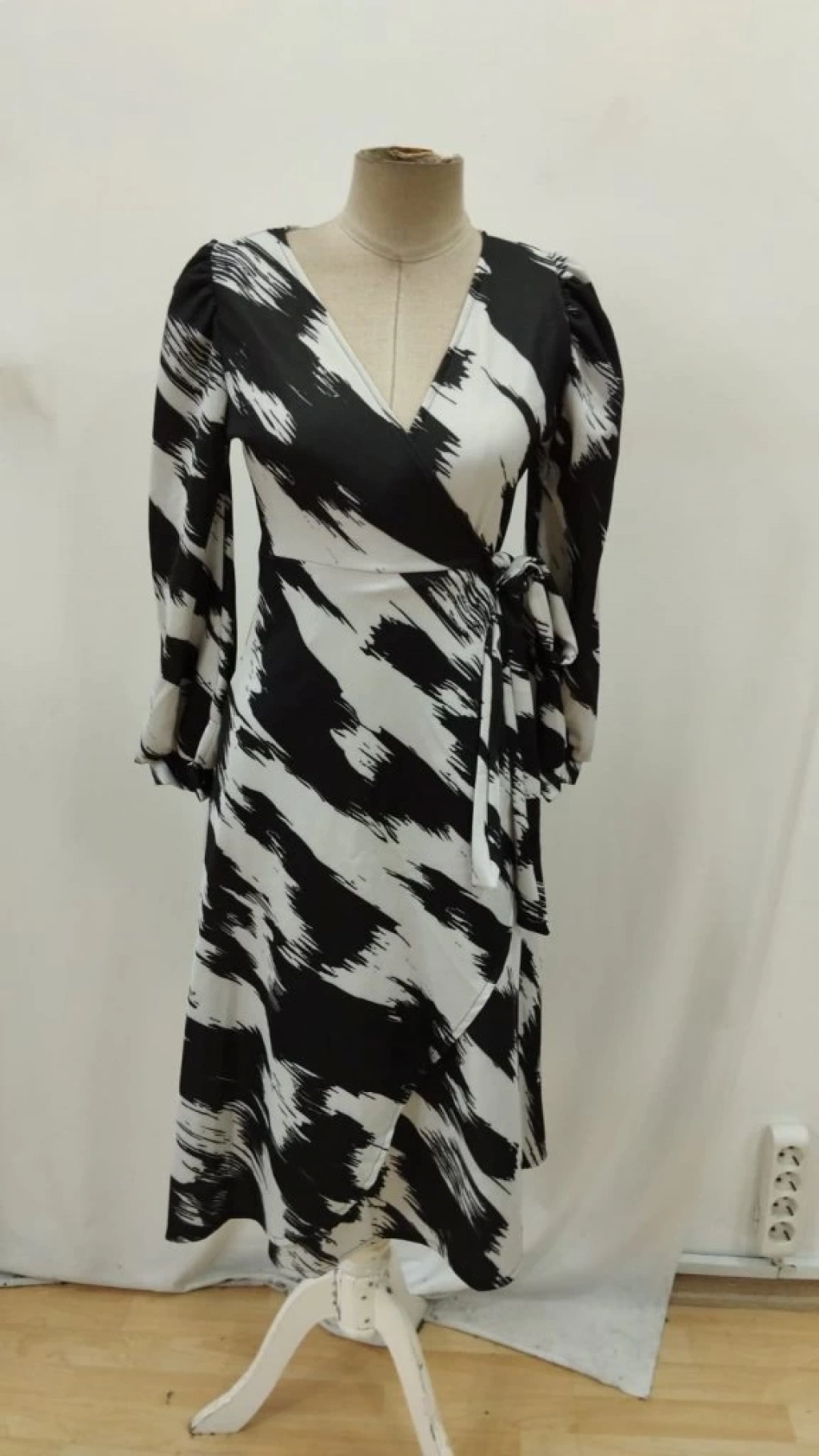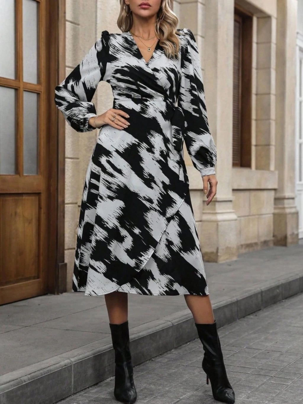 Kadın Uzun Kollu Kruvaze Yakalı Yandan Bağlamalı Desenli Mini Modal Elbise