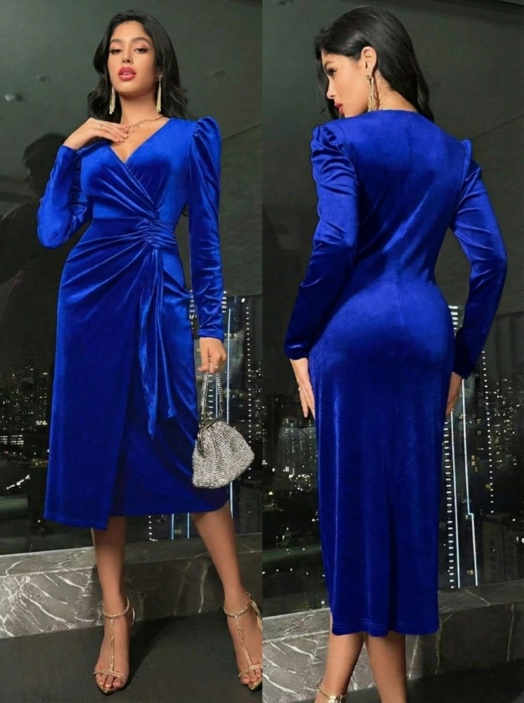 Kadın Uzun Kollu Kruvaze Yakalı Yandan Büzgülü Midi Kadife Elbise