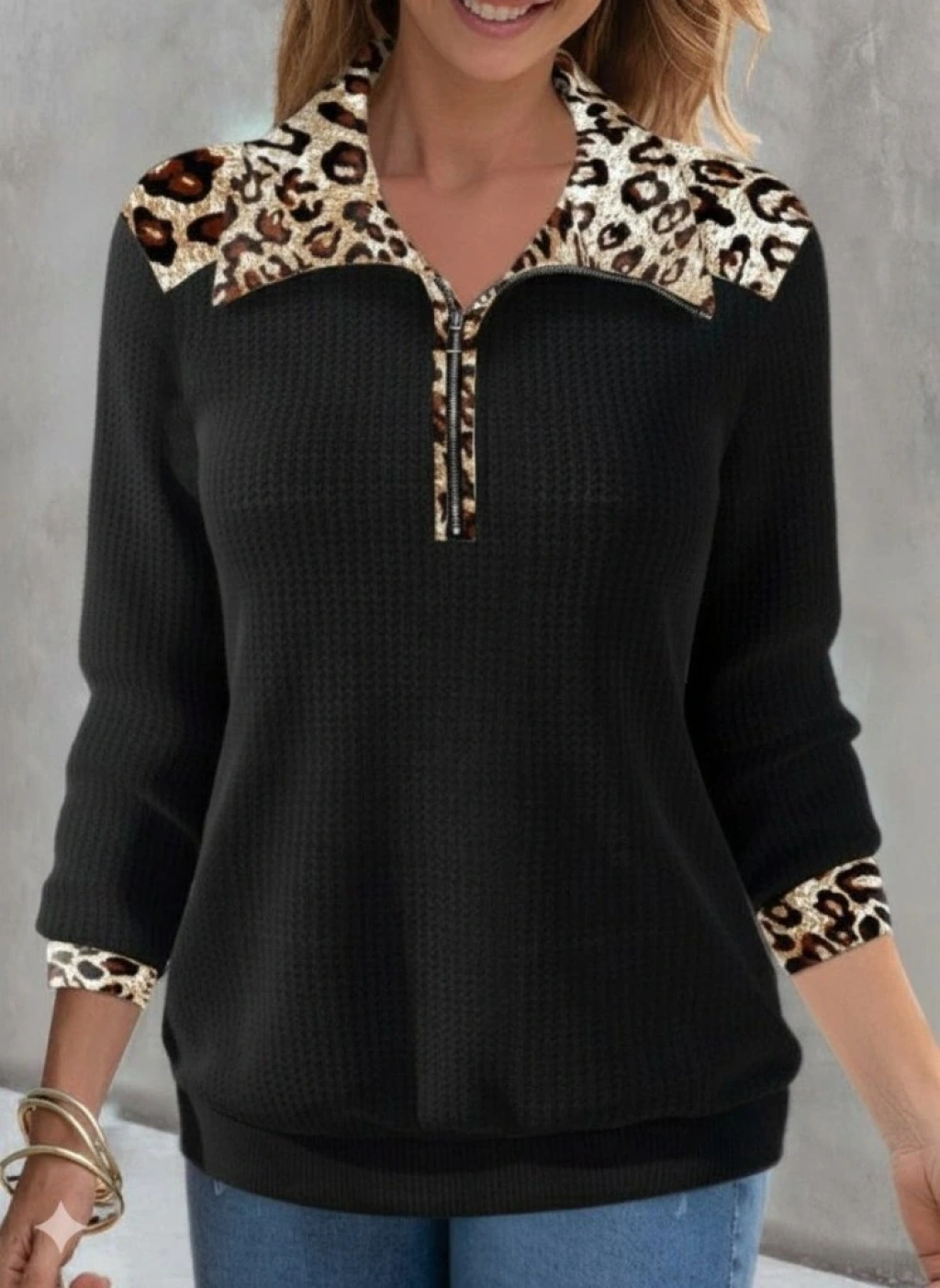 Kadın Uzun Kollu Leopar Yakalı Fermuarlı Waffle Bluz