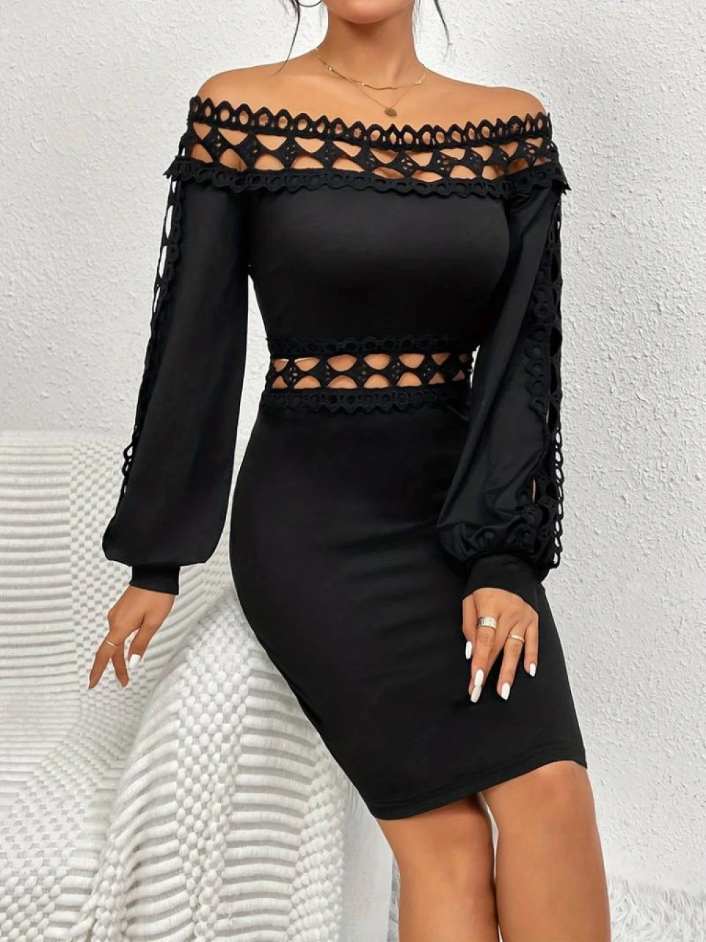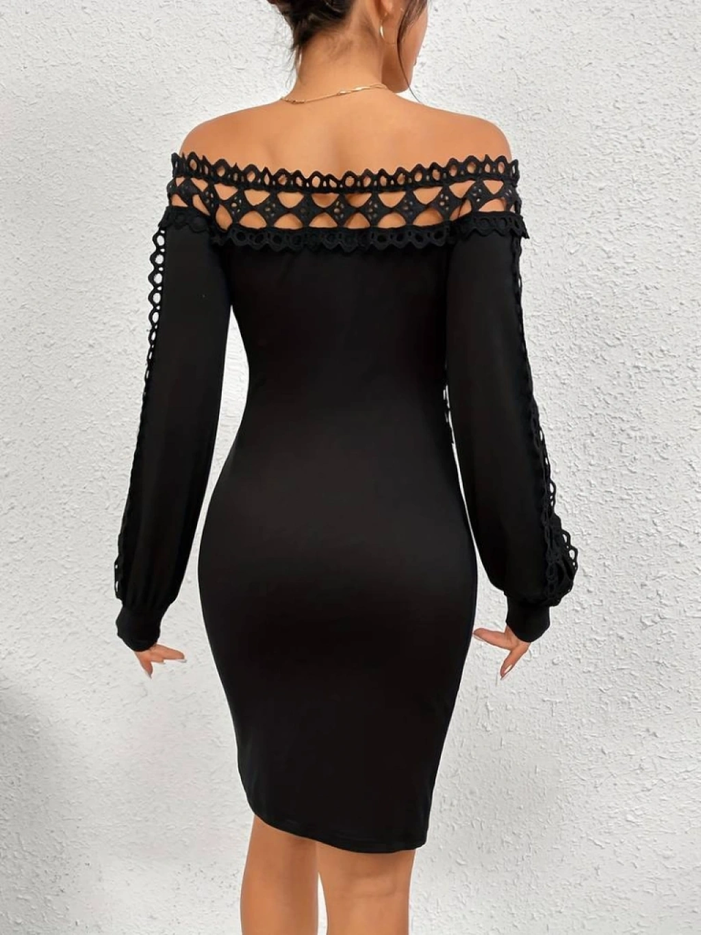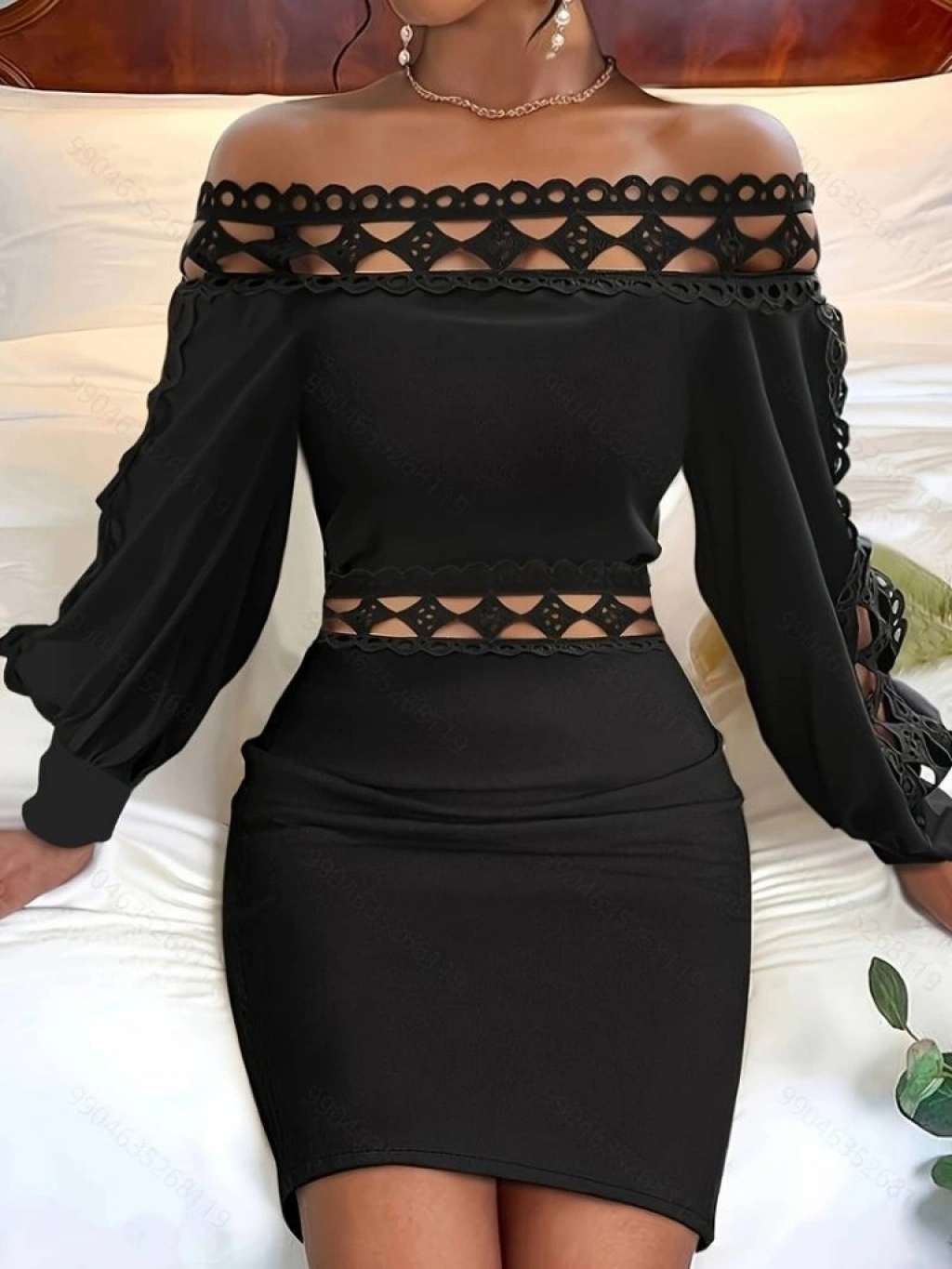 Kadın Uzun Kollu Madonna Yaka Kol Yaka Bel Dantel Detay şardonlu Dalgıç Elbise