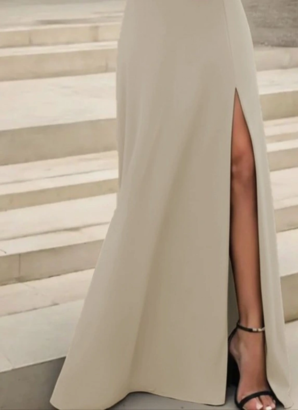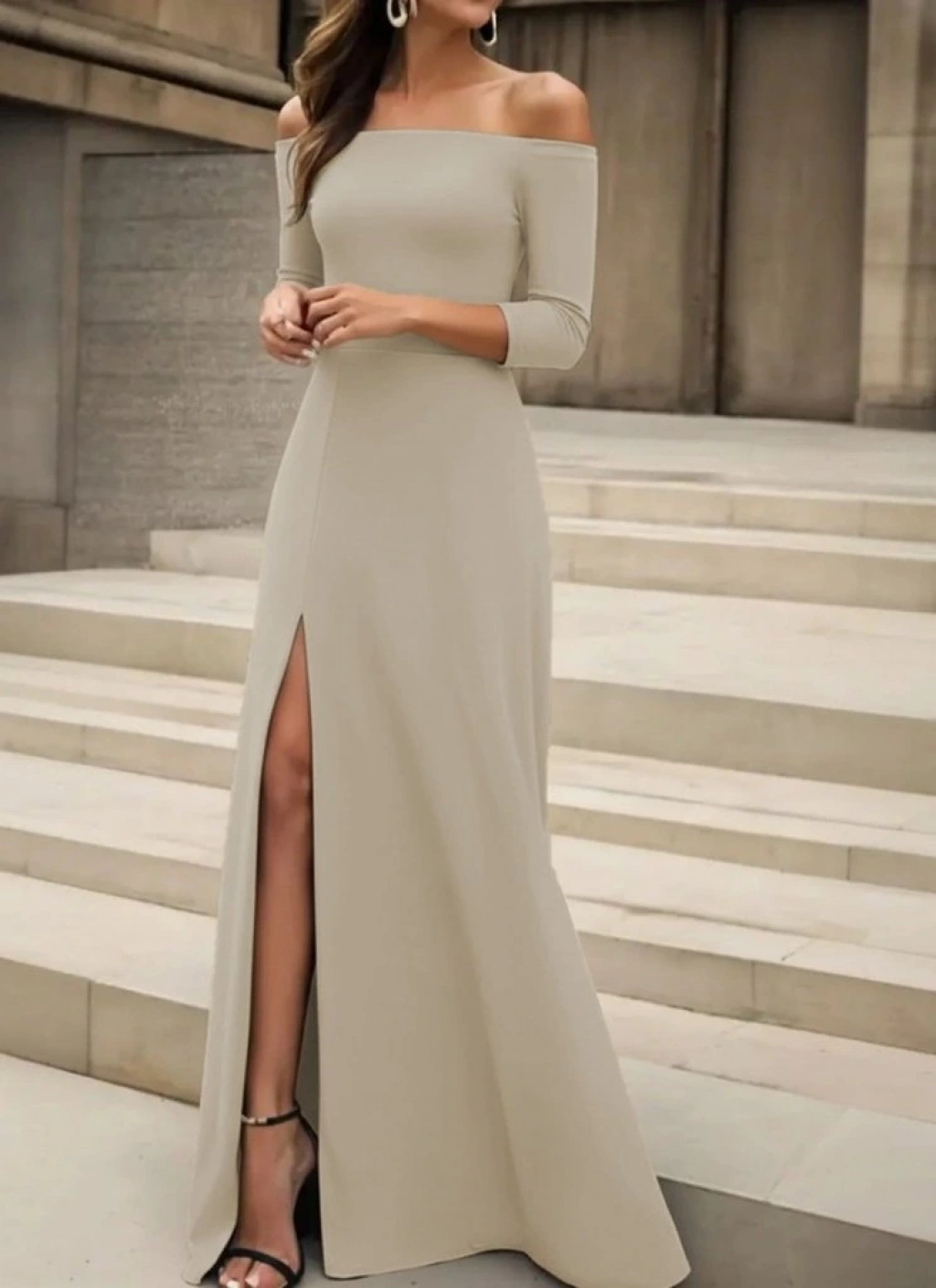 Kadın Uzun Kollu Madonna Yakalı Yırtmaç Detaylı Uzun Ithal Krep Elbise