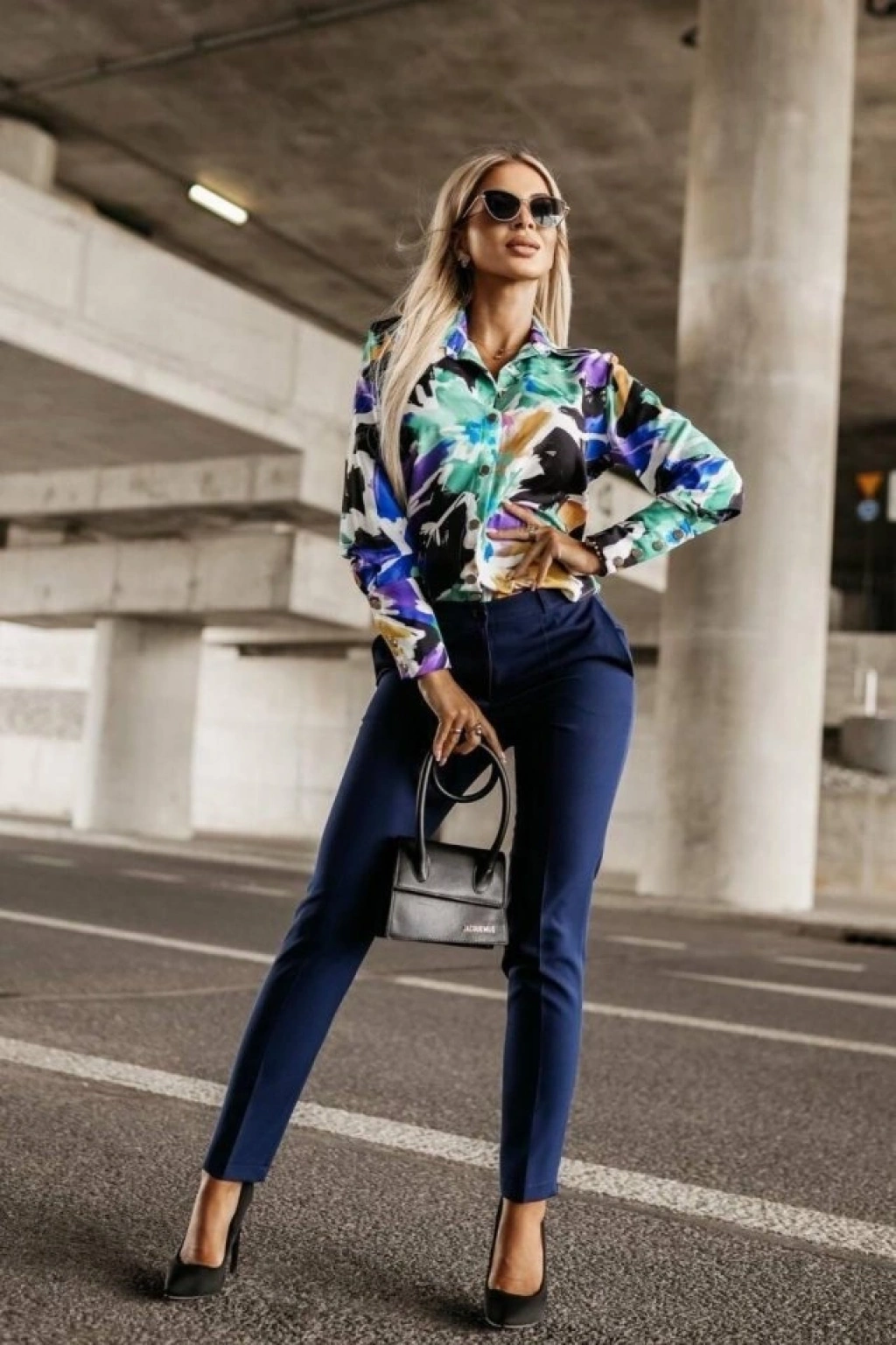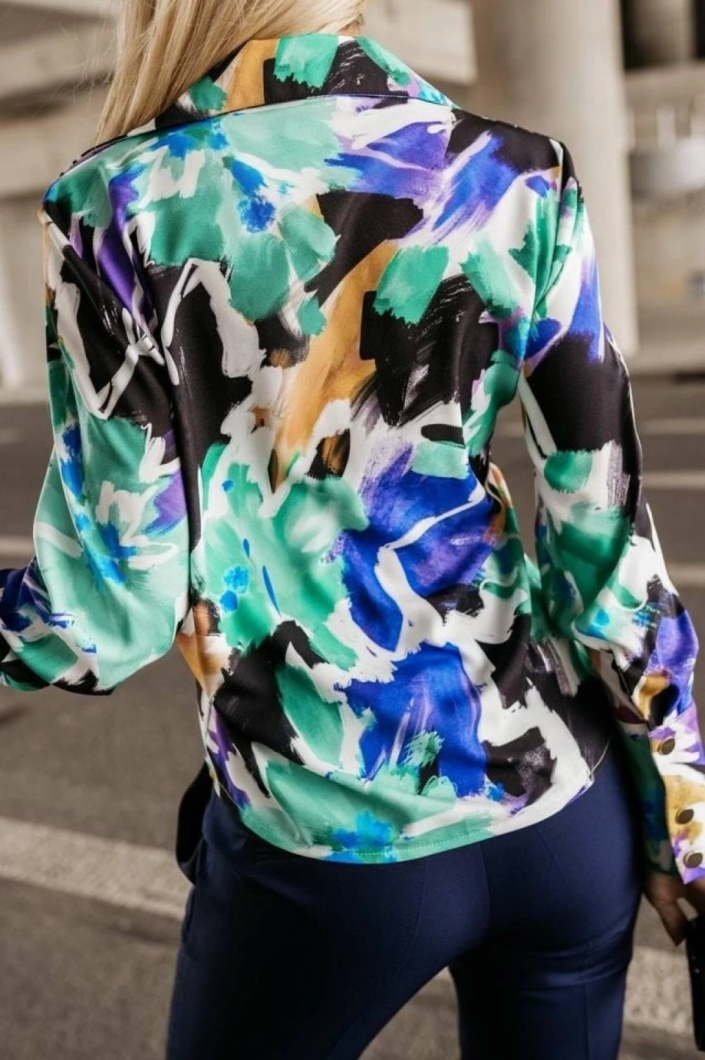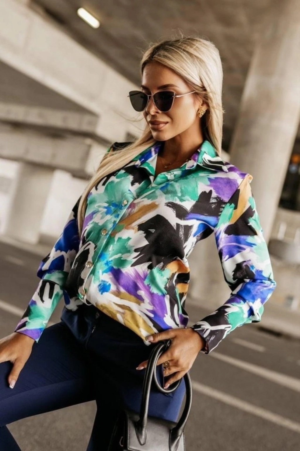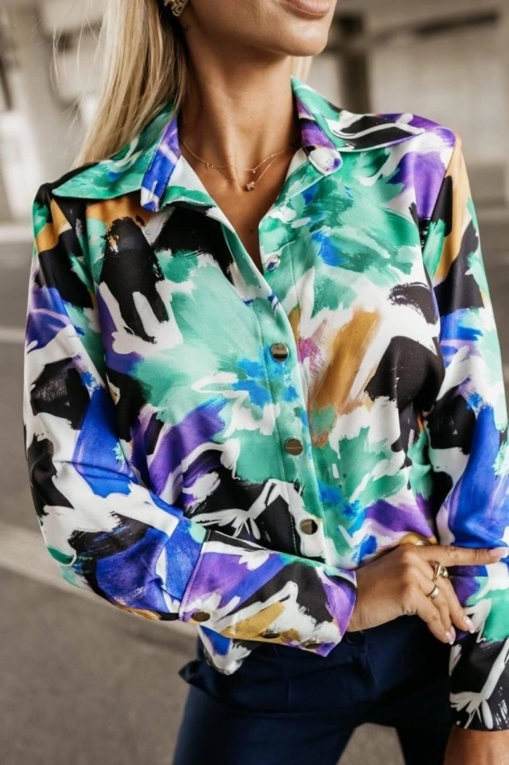 Kadın Uzun Kollu Metal Düğme Detay Renk Baskılı Mosskrep Kumaş Gömlek