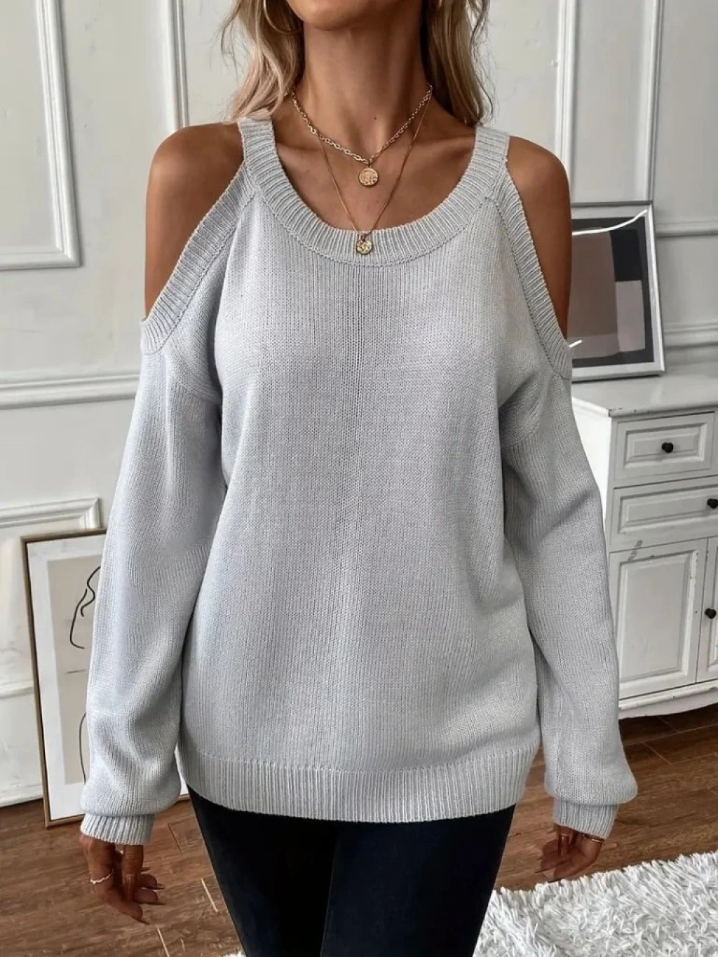 Kadın Uzun Kollu Omuzlardan Açık Askılı Triko Bluz