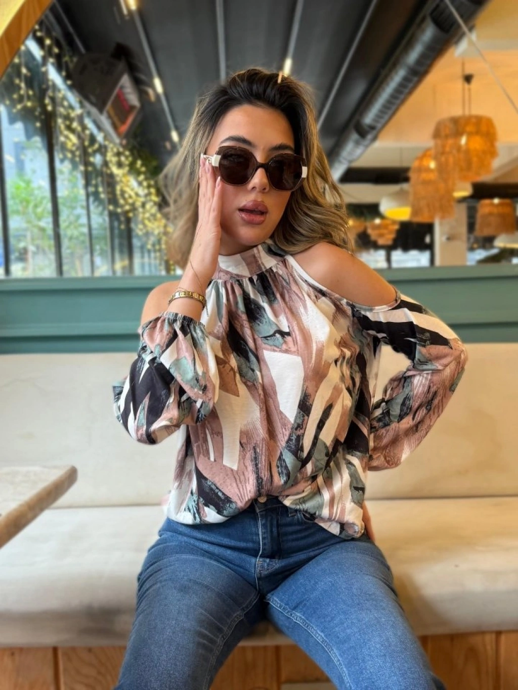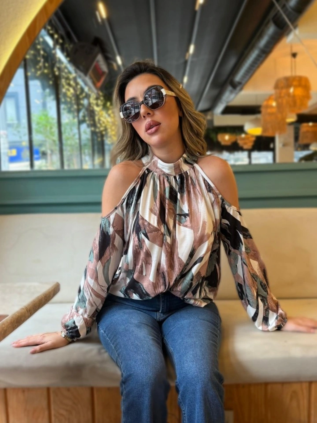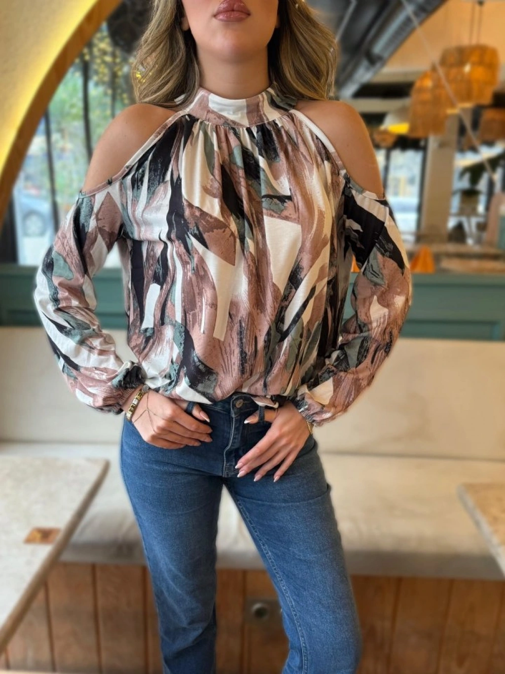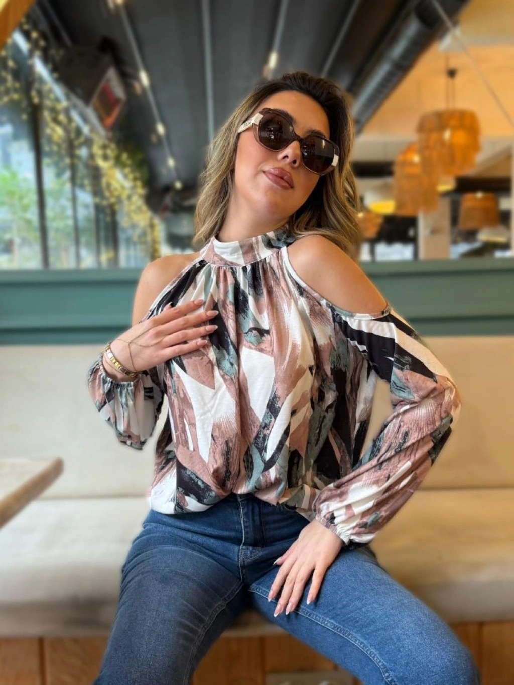 Kadın Uzun Kollu Omuzlardan Açık Balıkçı Yaka Desenli Süprem Bluz