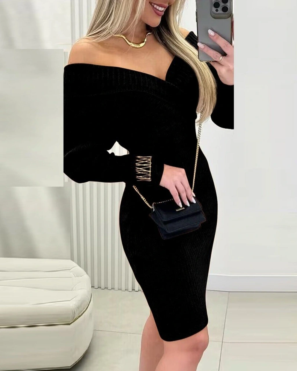 Kadın Uzun Kollu Omuzlardan Açık Kruvaze Yaka Kısa Triko Elbise