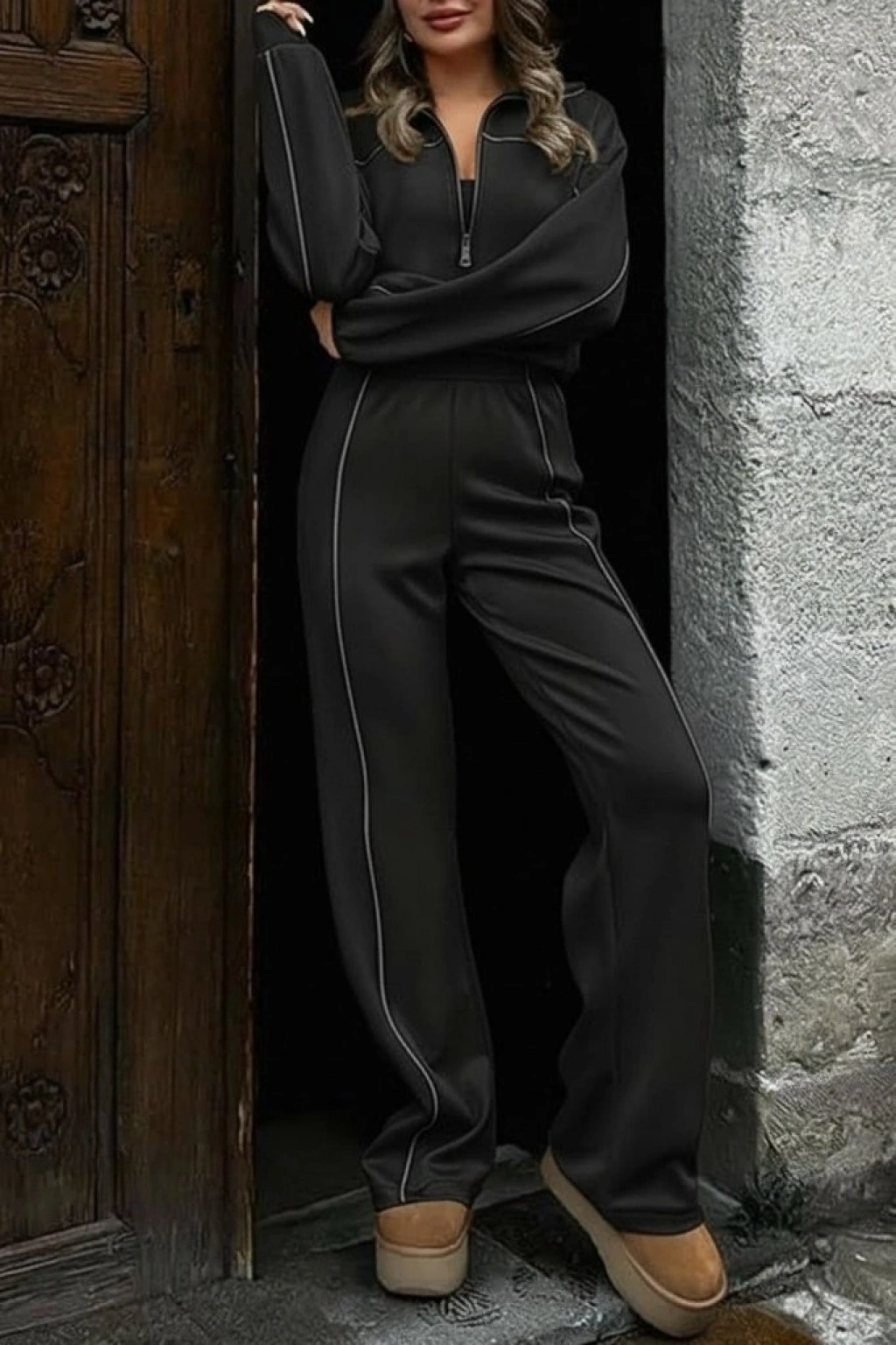 Kadın Uzun Kollu önden Fermuarlı Bluz Ve Pantolon Modal Ikili Takım