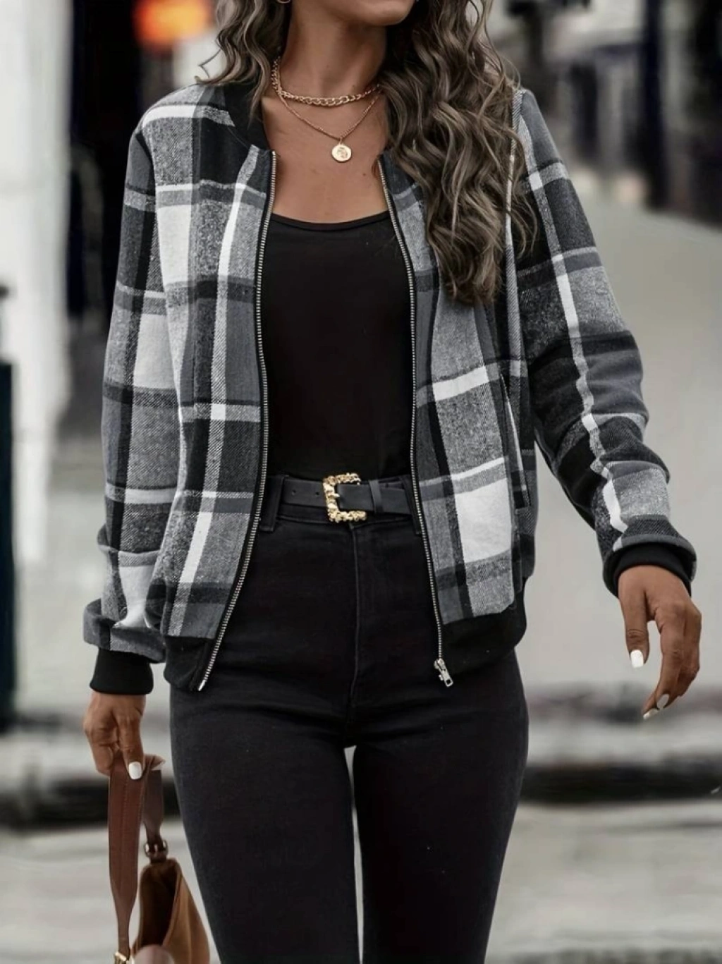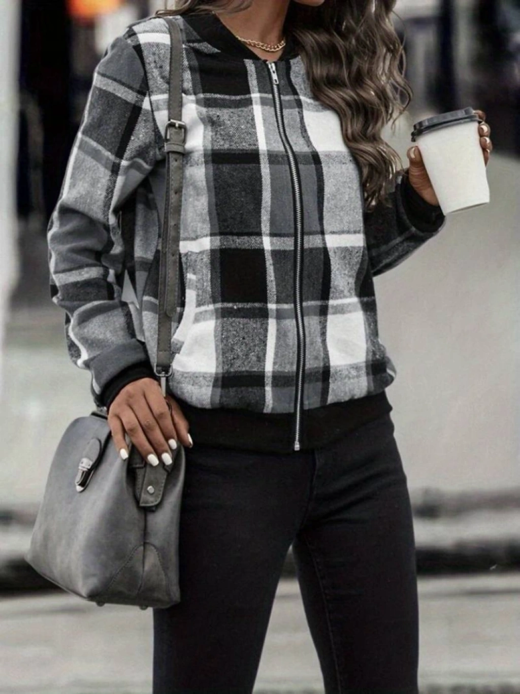 Kadın Uzun Kollu önden Fermuarlı Ekose Desenli Ceket