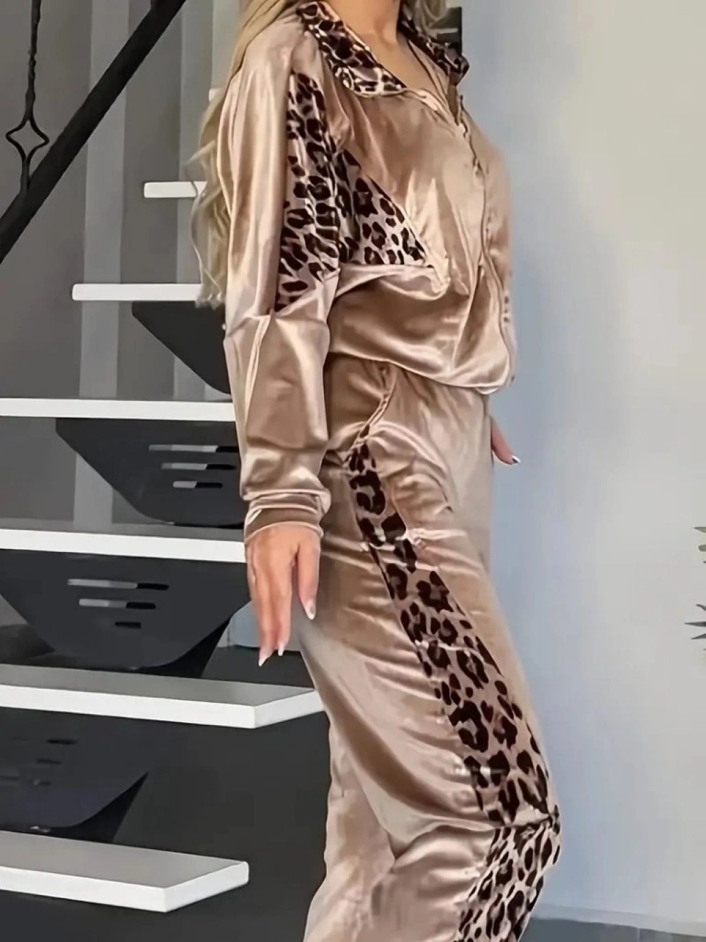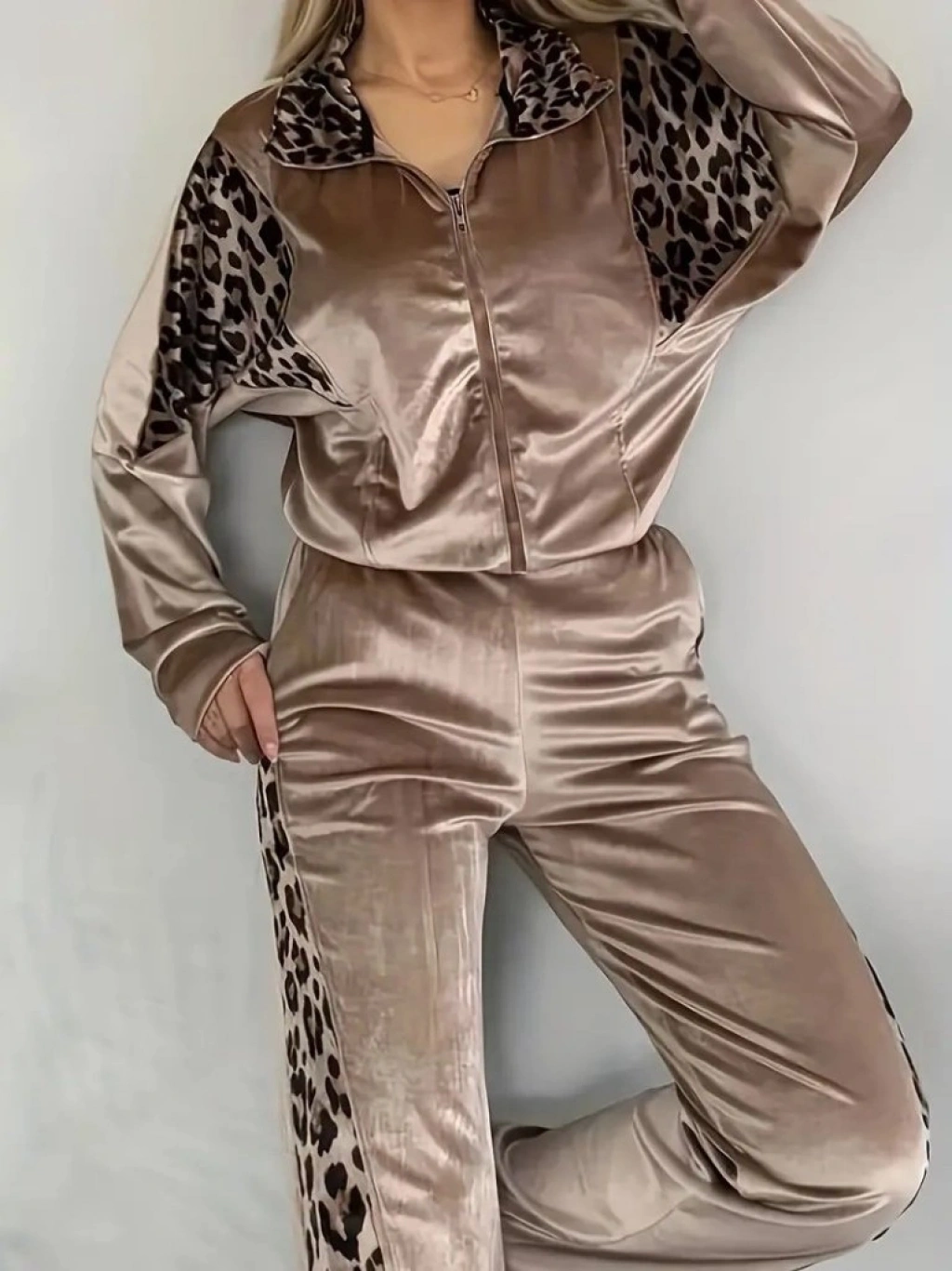 Kadın Uzun Kollu önden Fermuarlı Leopar Detaylı Kadife Bal Köpüğü Bluz Ve Pantolon Ikili Takım