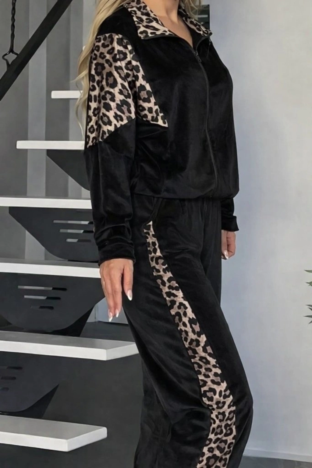 Kadın Uzun Kollu önden Fermuarlı Leopar Detaylı Kadife Bluz Ve Pantolon Ikili Takım