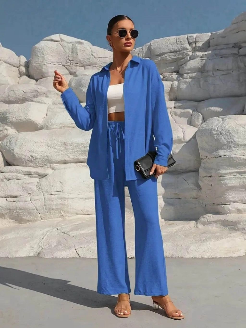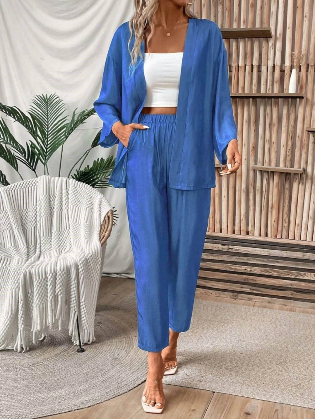 Kadın Uzun Kollu önü Açık Dokuma Ceket Ve Pantolon Ikili Takım
