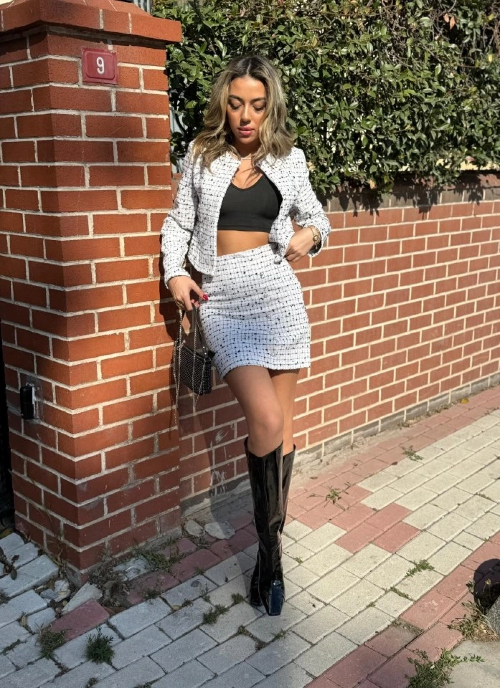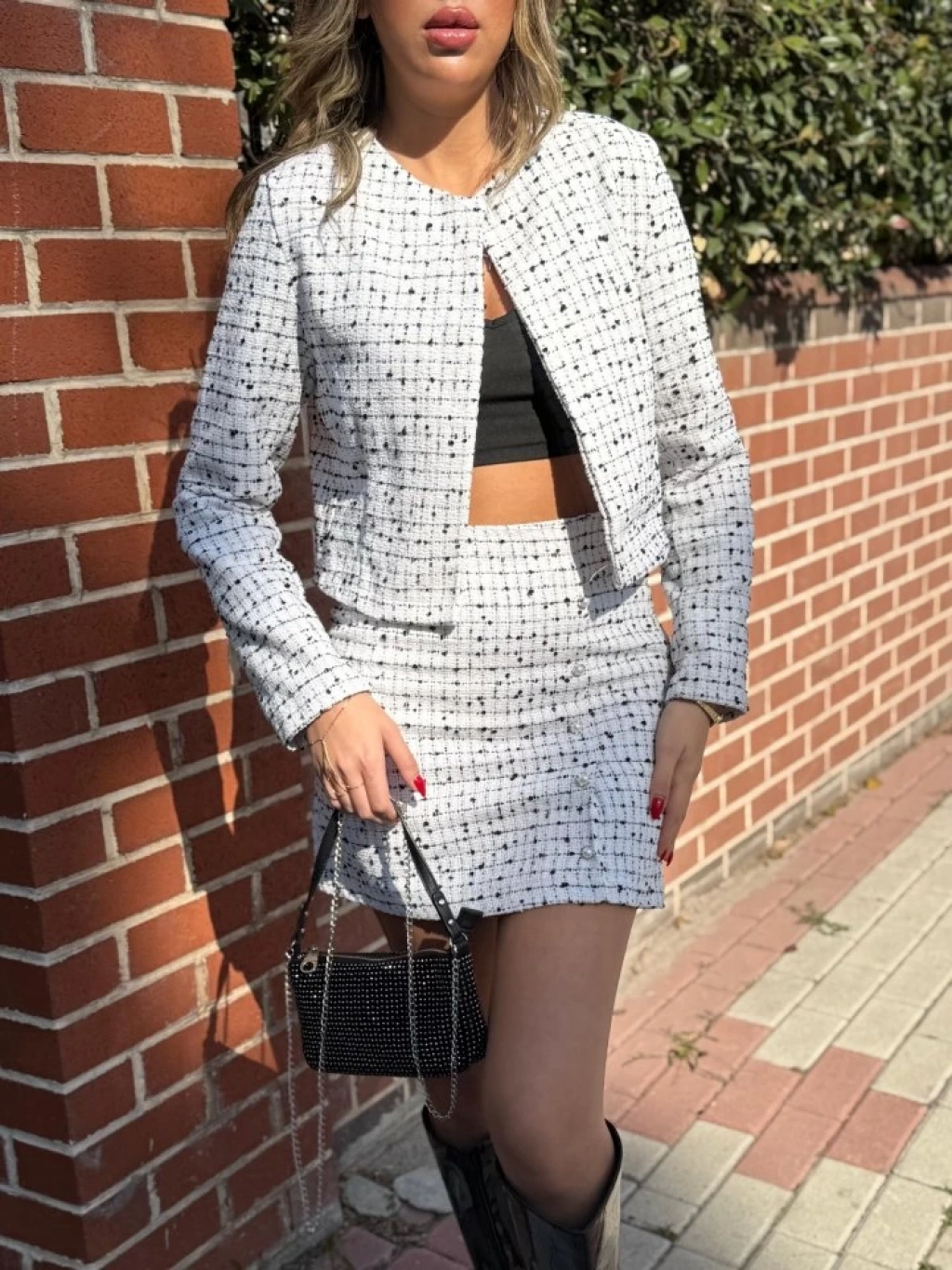 Kadın Uzun Kollu önü Açık Düğme Detaylı Dokuma Ceket Etek Ikili Takım