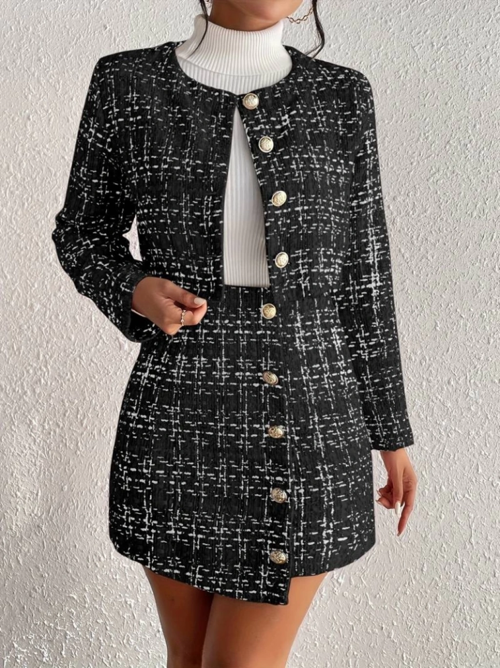 Kadın Uzun Kollu önü Düğmeli şanel Ceket Ve Etek Takım
