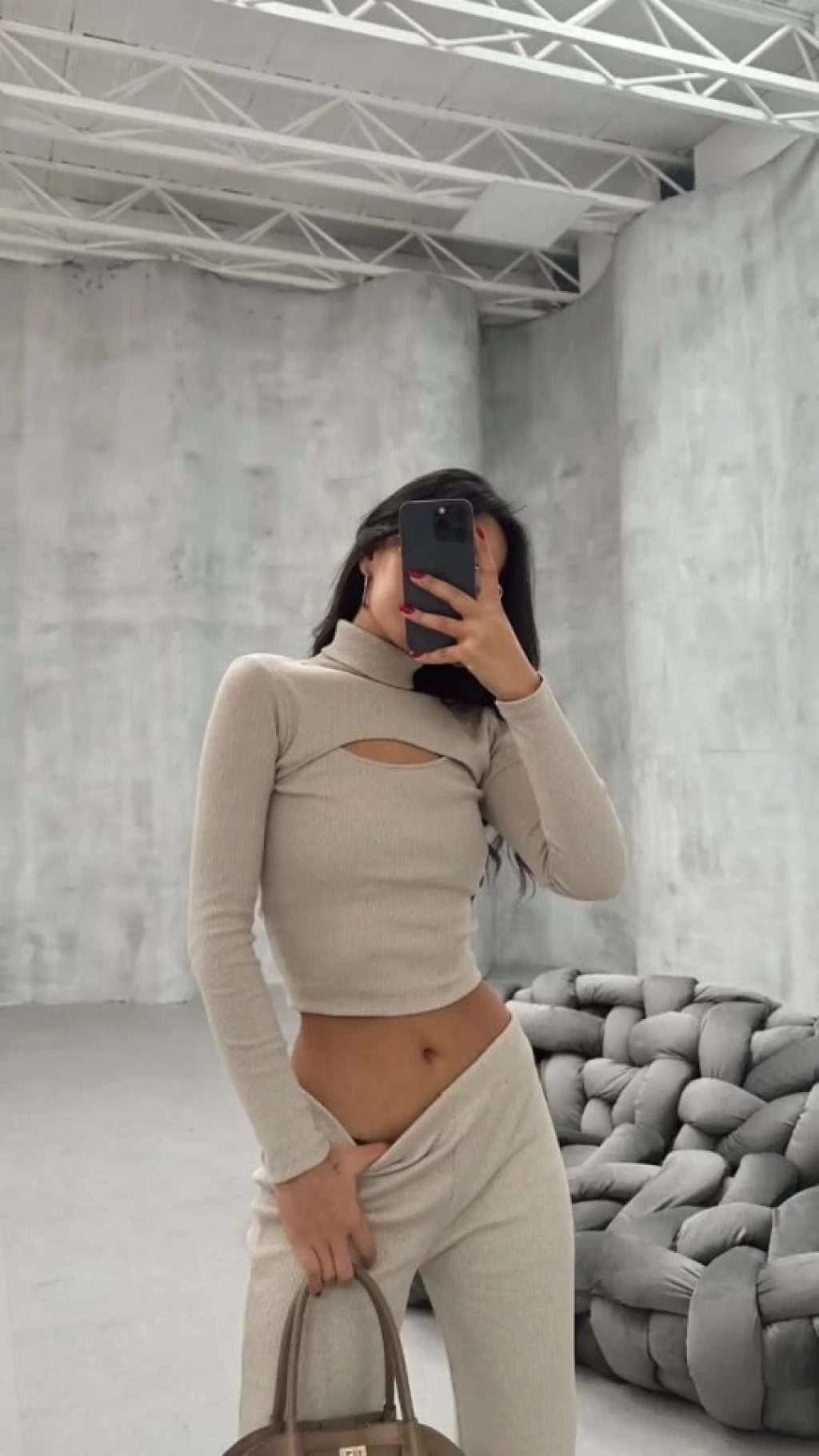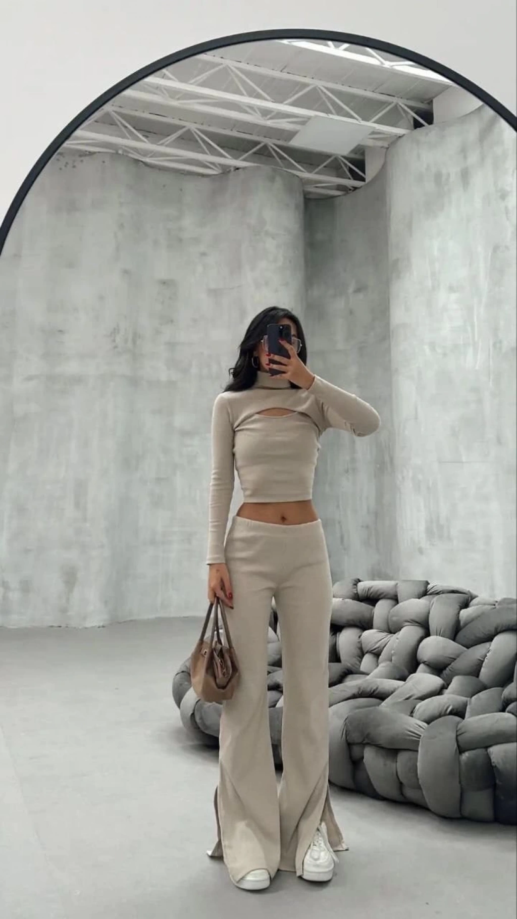 Kadın Uzun Kollu Pencere Detay Göğüs Dekolteli Bluz Ve Bol Paça Pantolon Ikili Takim
