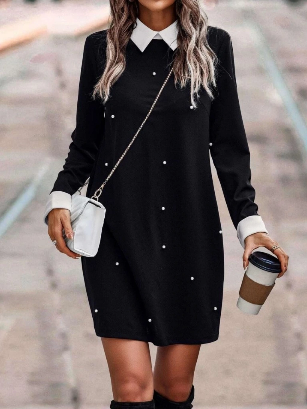 Kadın Uzun Kollu Polo Yaka Inci Detay Krep Elbise