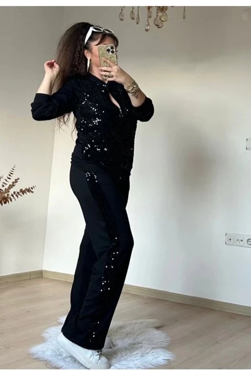 Kadın Uzun Kollu Pul Payet Detay Fermuarlı Iki Iplik Kumaş Ikili Takım