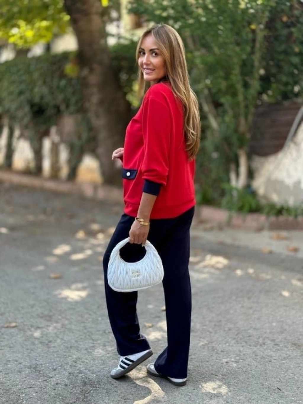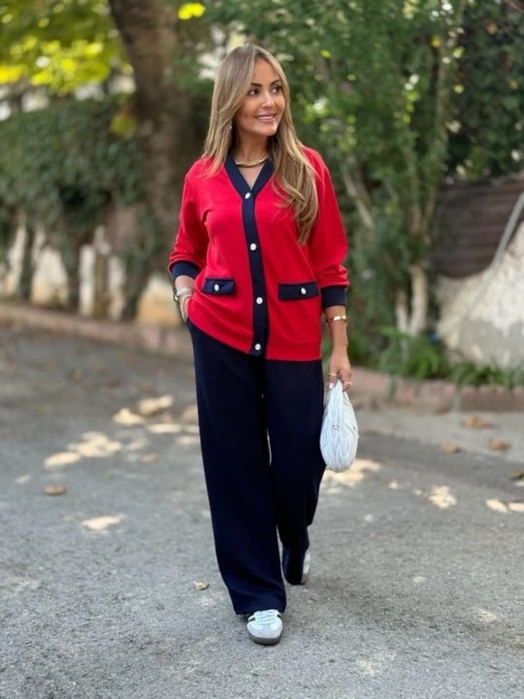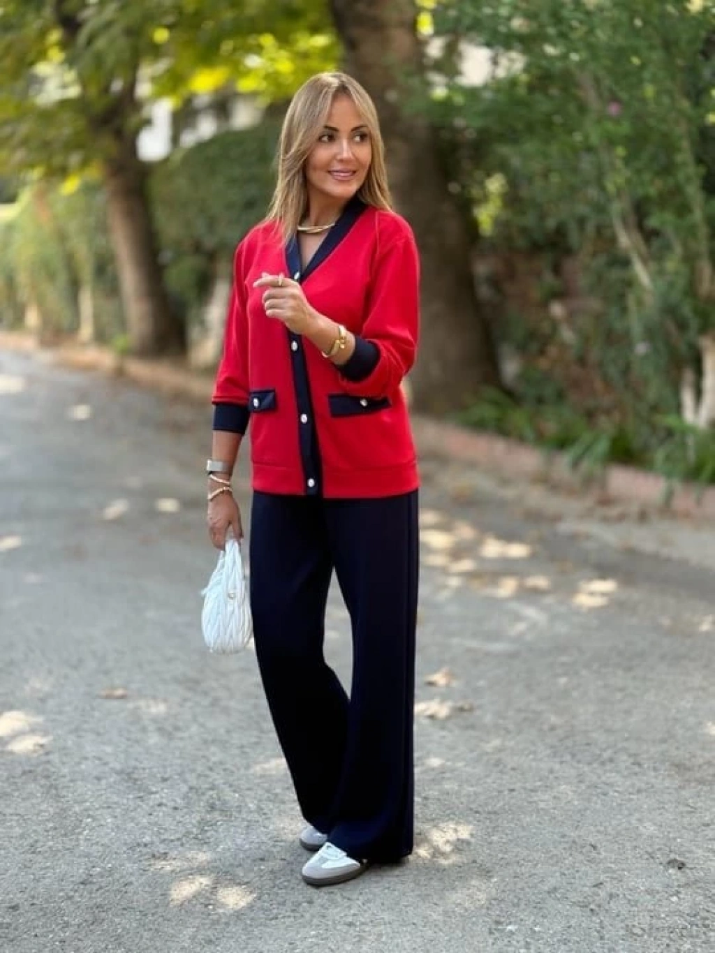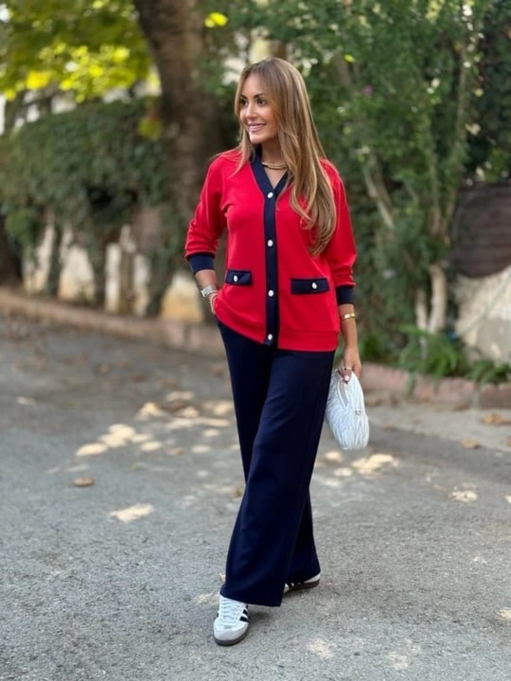 Kadın Uzun Kollu Ribanali Cep Detay Hırka Ve Bol Paça Pantolon Ikili Takım