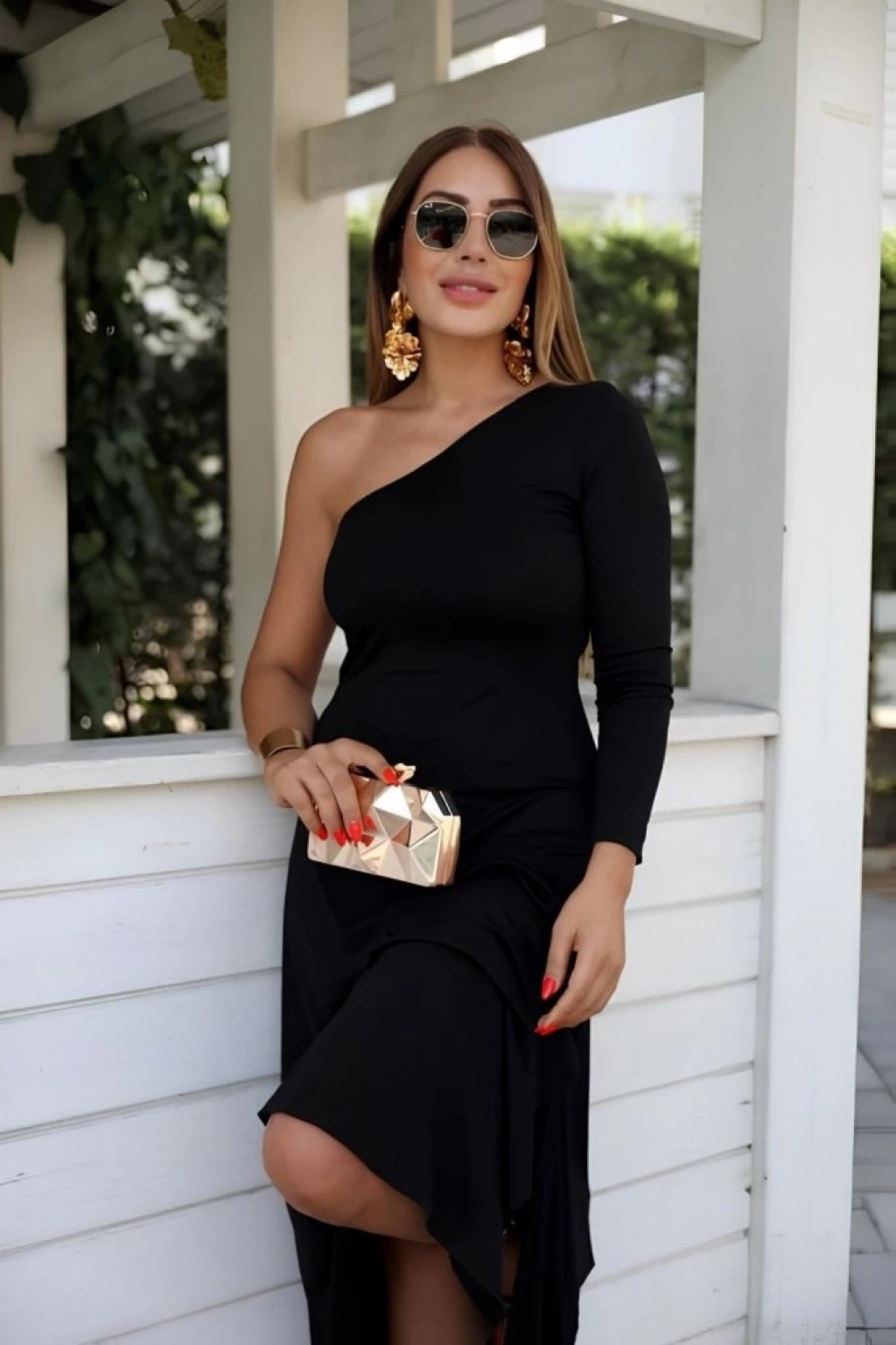 Kadın Uzun Kollu Tek Omuz Detay Krep Elbise