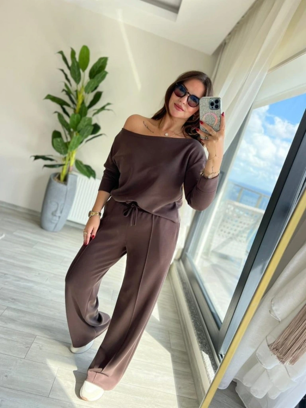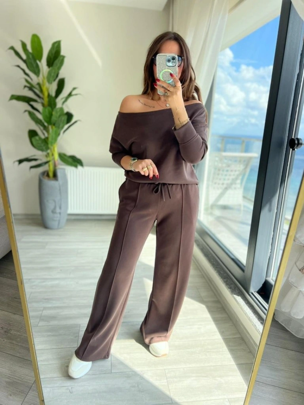 Kadın Uzun Kollu Tek Omuzdan Açık Modal Bluz Ve Pantolon Ikili Takım