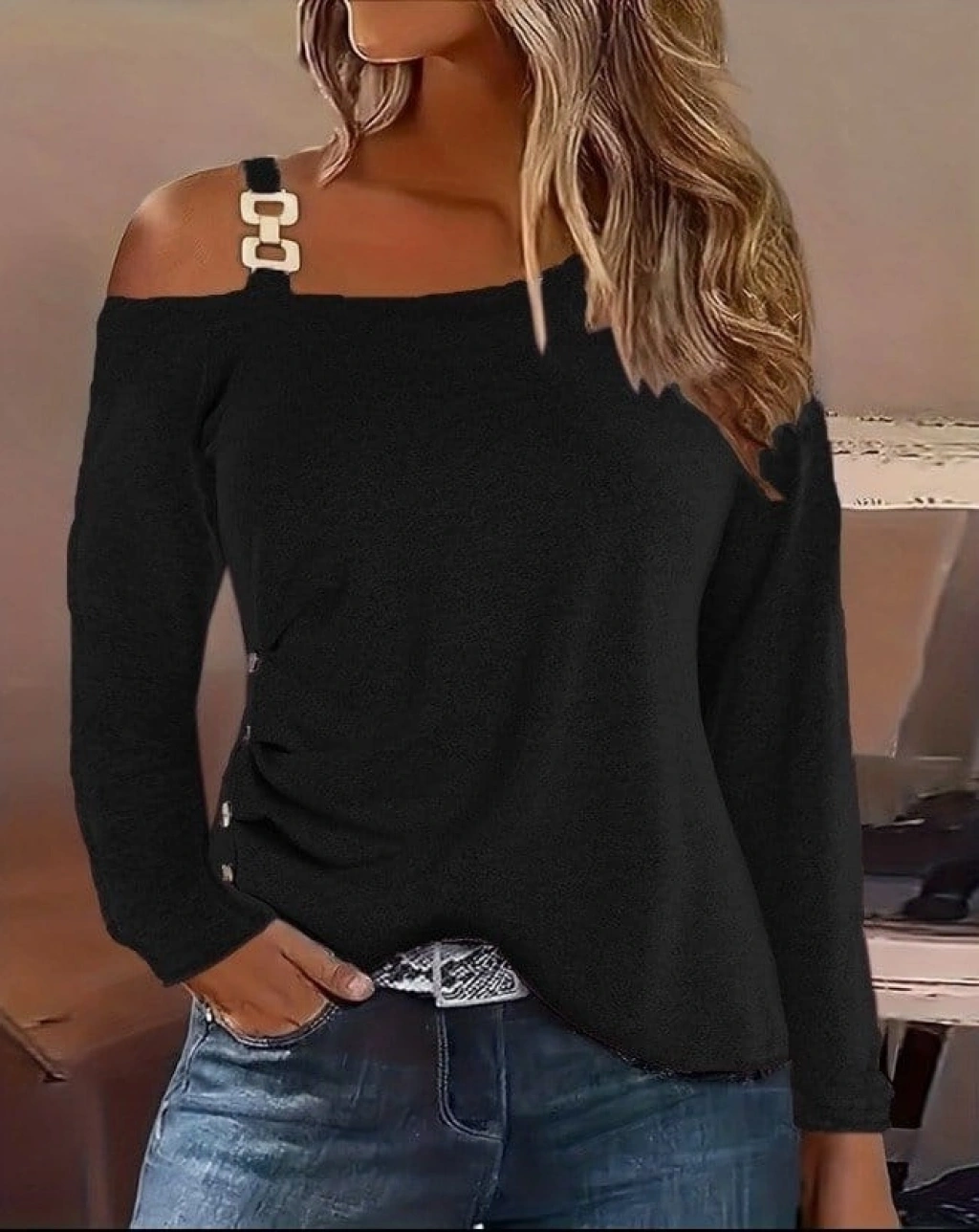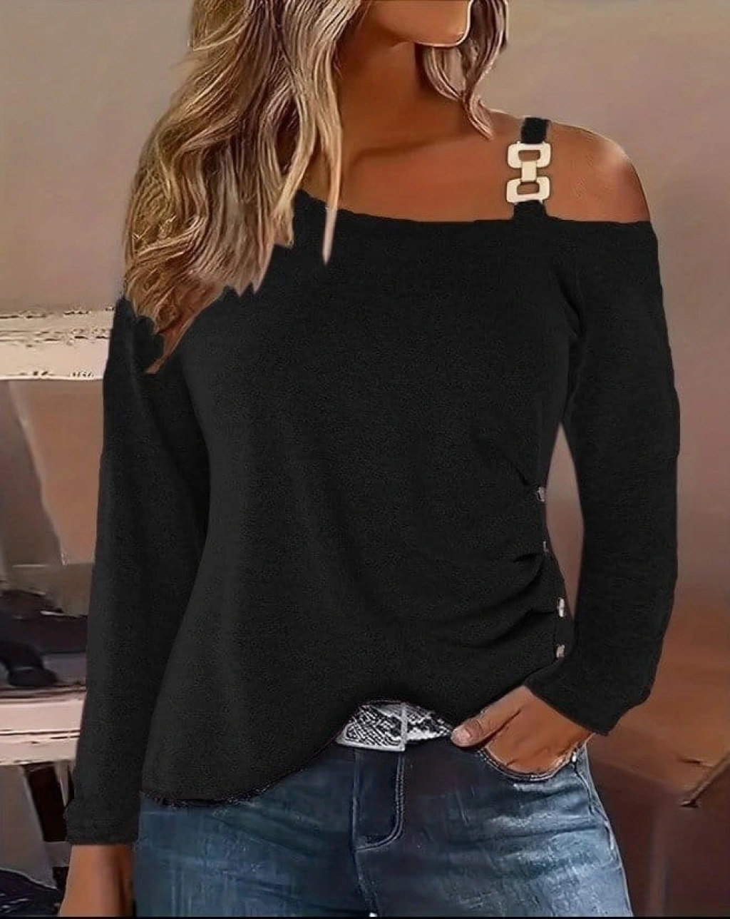 Kadın Uzun Kollu Tek Omuzu Açık Askılı Toka Ve Düğme Detaylı Yumuşak Bluz