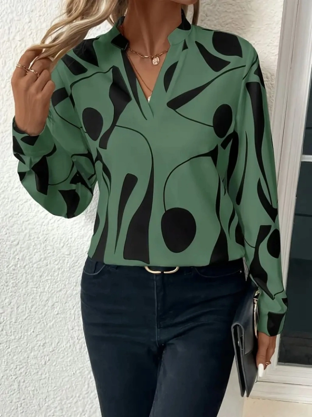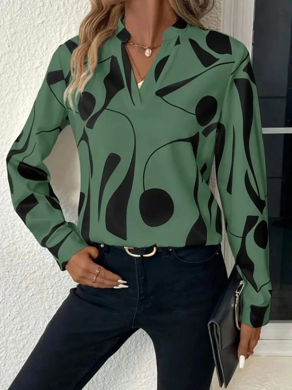 Kadın Uzun Kollu V Hakim Yakalı Desenli Dalgıç Bluz